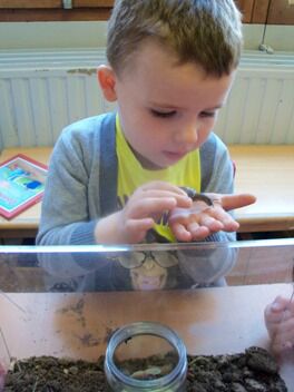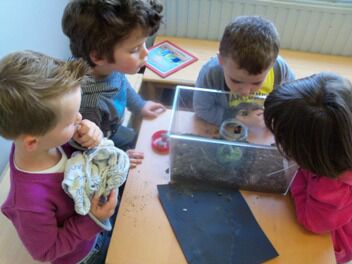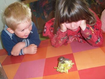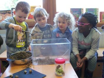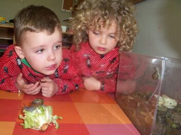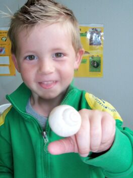 De afgelopen (halve) weken werkten we dus rond huisjesslakken. Tot nog toe vonden de kleuters lege slakkenhuisjes. Maar hoe zouden ze reageren op een huisjesslak? Iedereen was onmiddellijk vertederd. Zelfs de kleuters die schrik hebben voor spinnen en insekten.