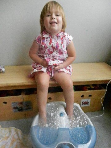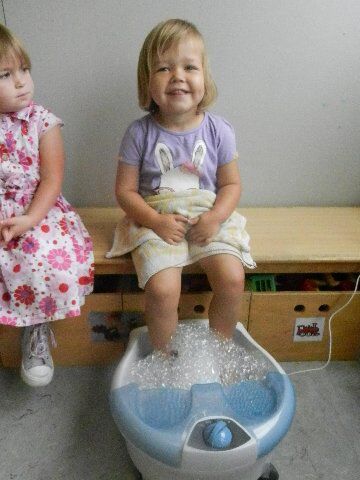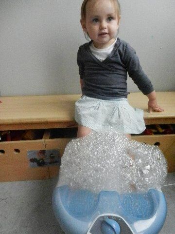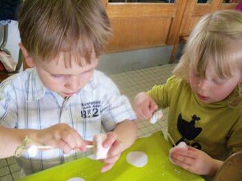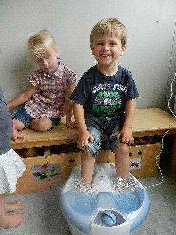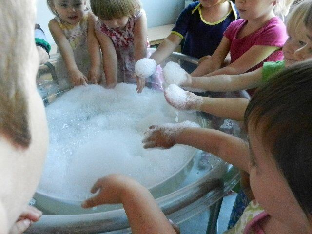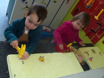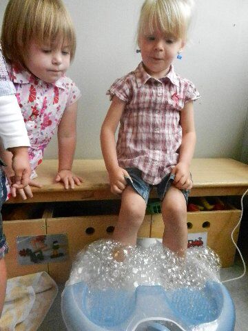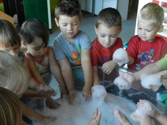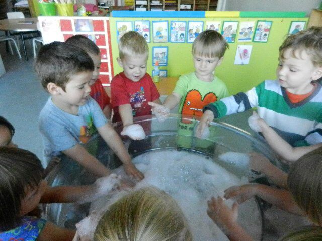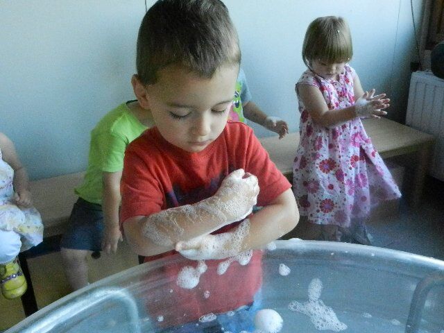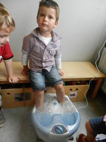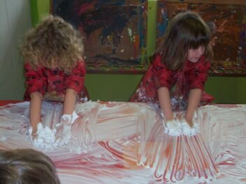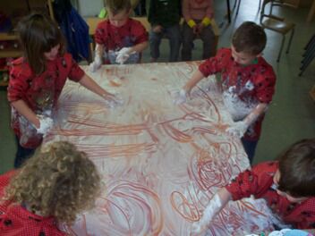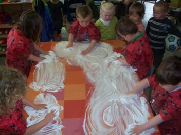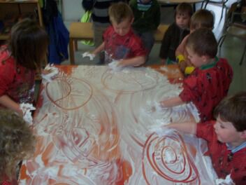 Scheerschuim werd op de tafel gespoten. We smeerden het uit en konden er allerlei tekeningen in maken, alsook een slakkenhuis (spiraal).