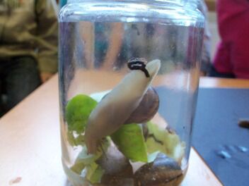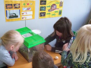 We zagen in boekjes wat we nodig hadden om de slakken enkele dagen in de klas te kunnen houden. Keien, aarde, blaadjes, mos, een tak en wat water. We gingen aan de slag.