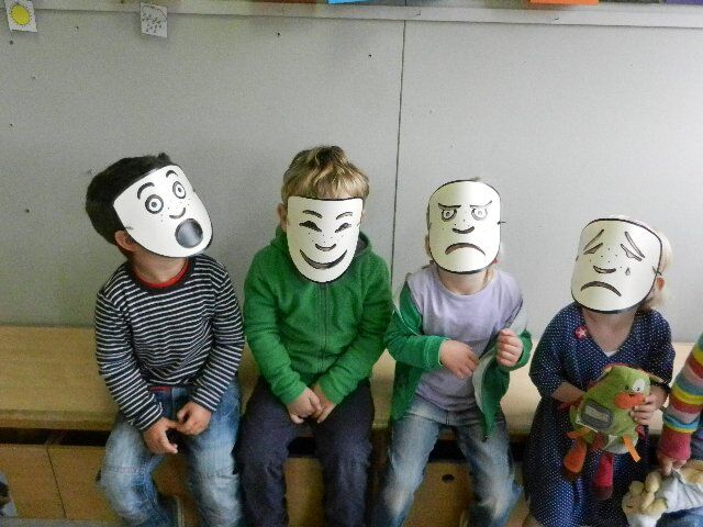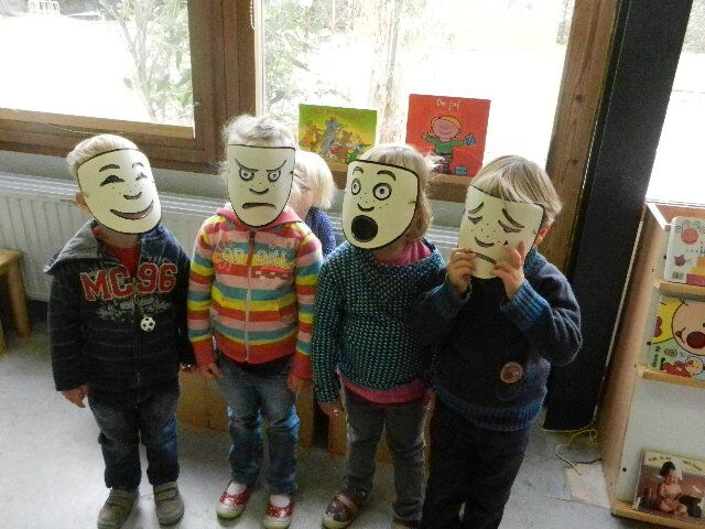 We bekeken niet alleen alle delen van ons hoofd. We keken ook eens in de spiegel als we blij, bang, boos of verdrietig zijn. En gekke bekken trekken konden de kleuters alvast heel goed.