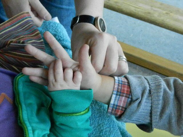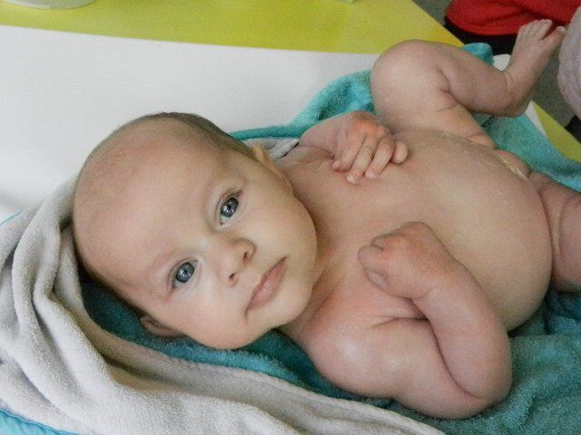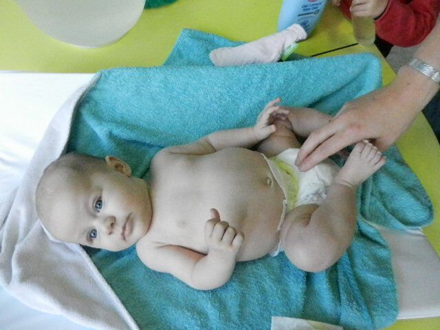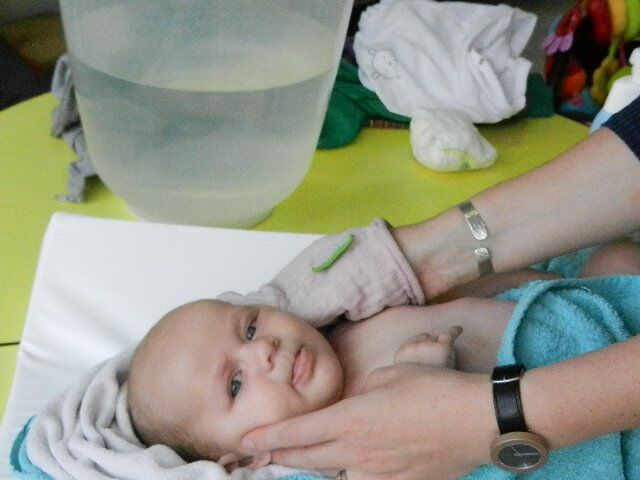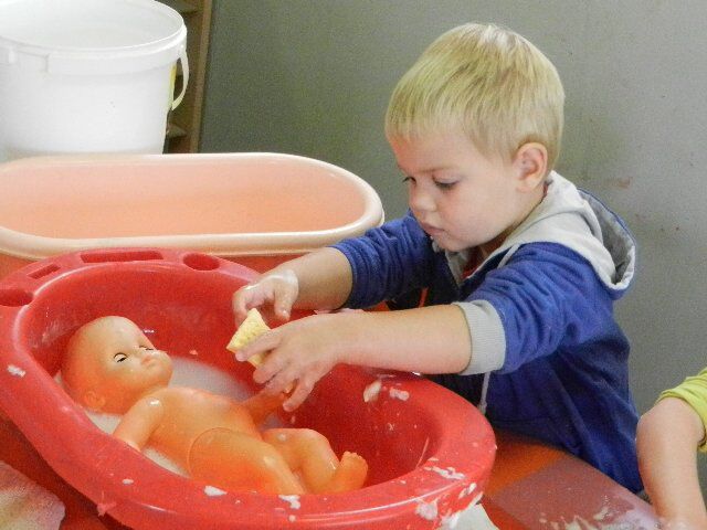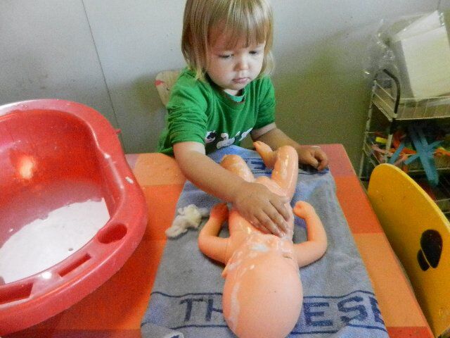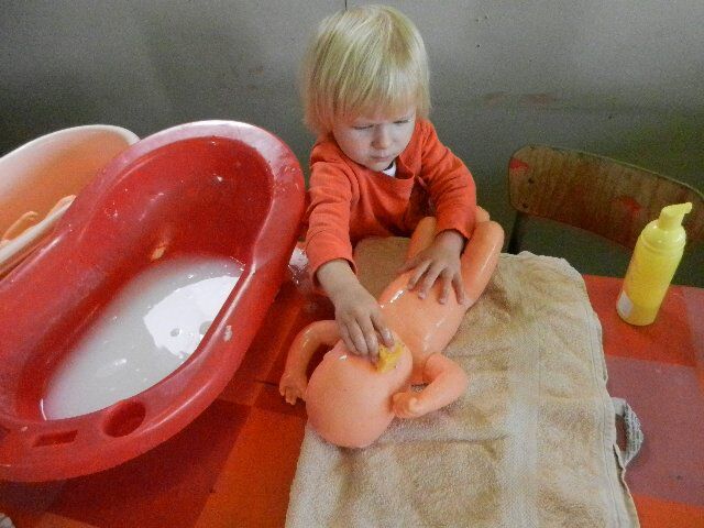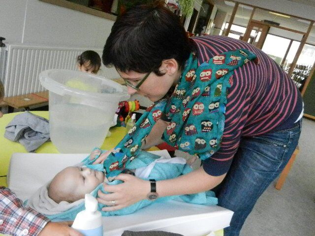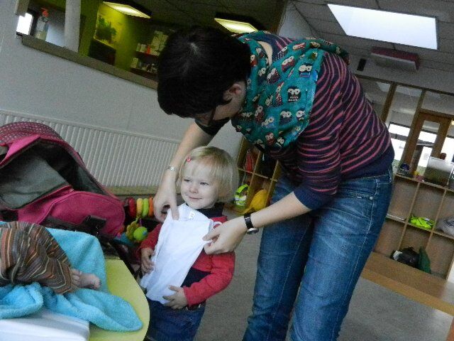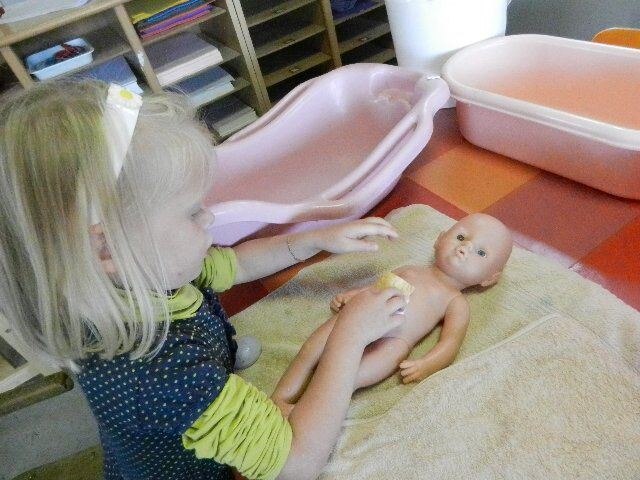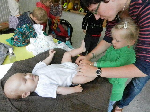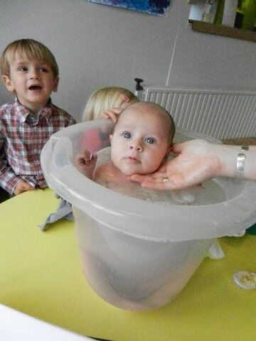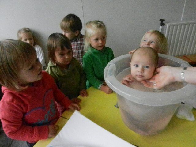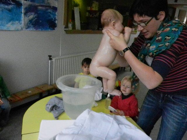 Lena een badje geven was een hele belevenis. Eerst legden we alles wat we nodig hadden netjes klaar. Lena's mama probeerde ons te foppen door veel te grote kleertjes uit te halen. Dat was niet juist! Het waren de kleren van zus Suze. We vergeleken onze handen, voeten met die van baby Lena. We benoemden telkens het lichaamsdeel die mama Heleen aan het wassen was. Voor de pamper uit ging mochten de kleuters raden of Lena een 'jongen of 'meisje' is. De meningen waren nogal verdeeld! Nadien was er geen discussie meer mogelijk. Lena is een 'echt' meisje! Dank u wel Heleen voor de leuke activiteit.