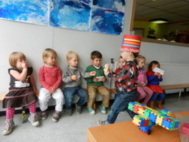 Ook deze keer vertrokken we weer met een bus enthousiaste kleuters naar de turnzaal. Zoals gewoonlijk gingen we van start met een paar kleuterdansjes. Nadien konden de kleuters zich uitleven in de verschillende werkposten. (trampoline, de brug, grote wielen, klossen, fietsen, basket,...)