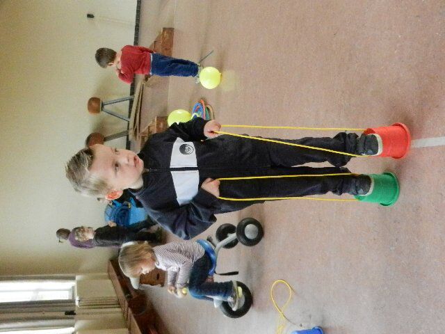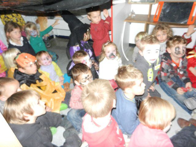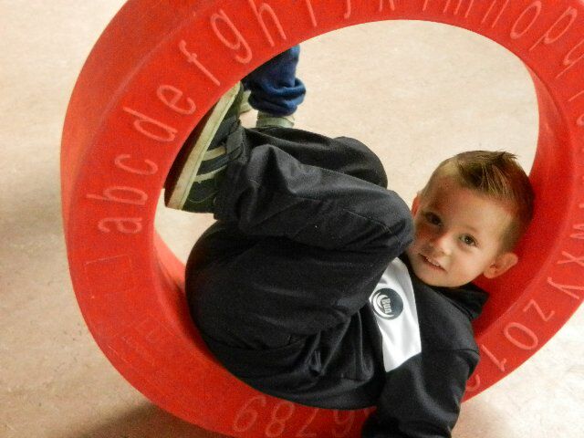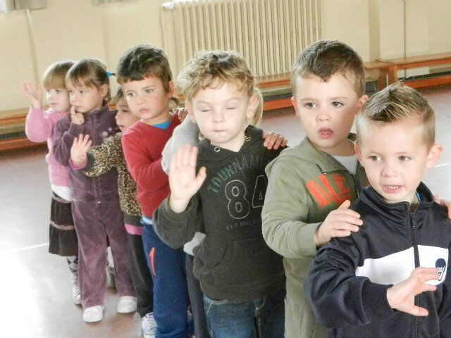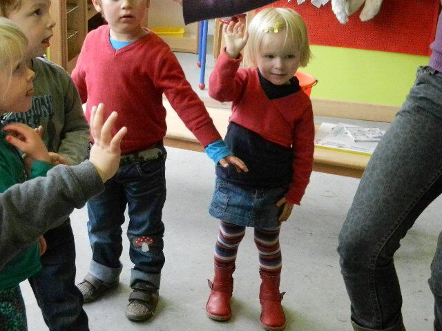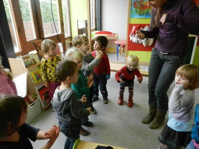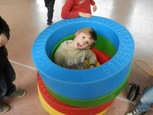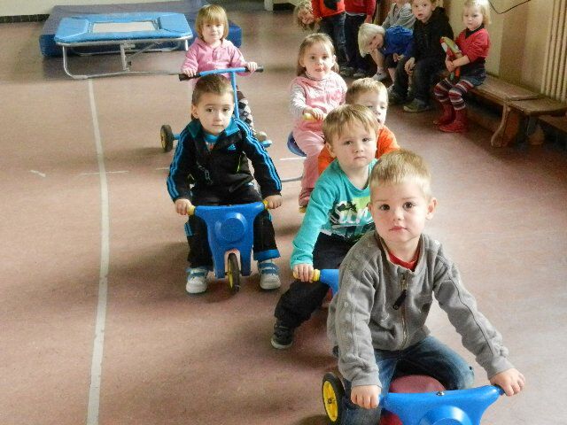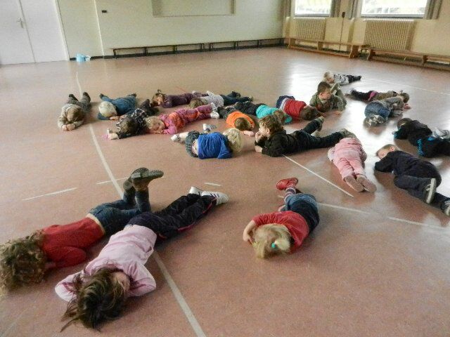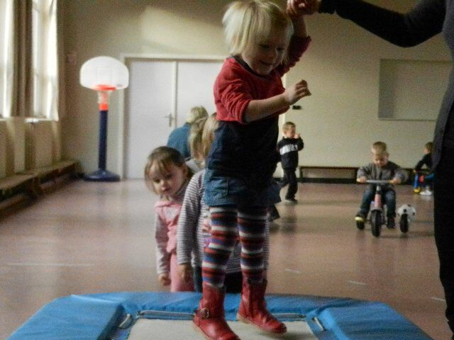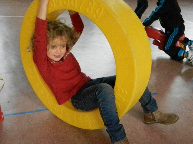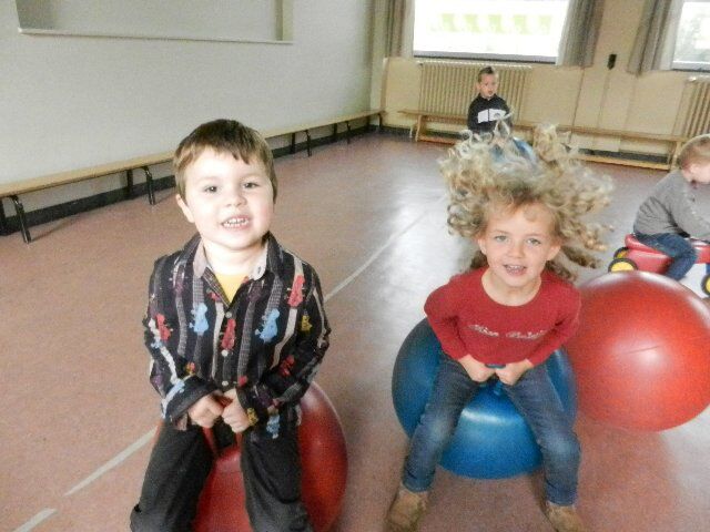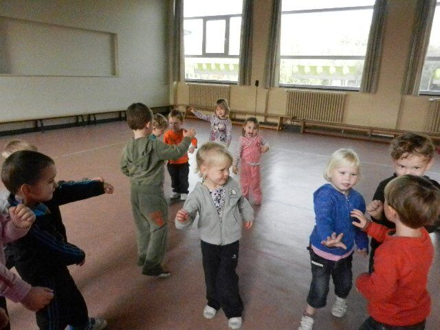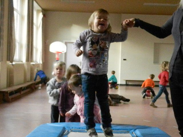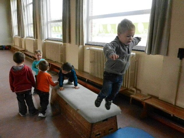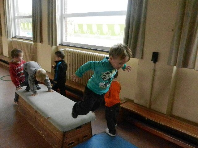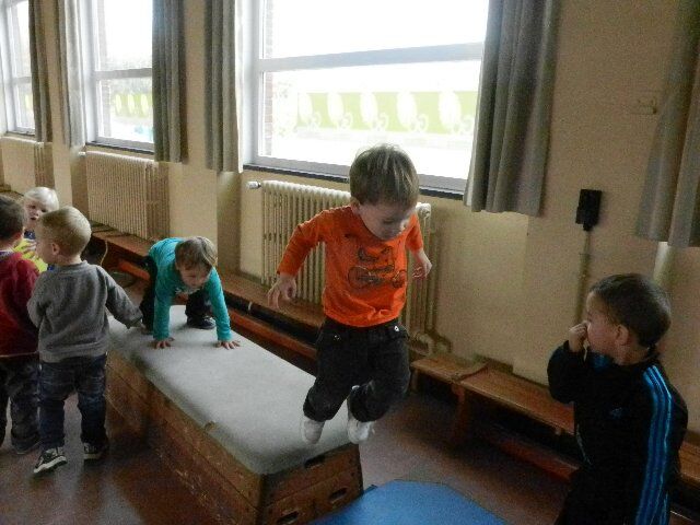 Ook deze keer vertrokken we weer met een bus enthousiaste kleuters naar de turnzaal. Zoals gewoonlijk gingen we van start met een paar kleuterdansjes. Nadien konden de kleuters zich uitleven in de verschillende werkposten. (trampoline, de brug, grote wielen, klossen, fietsen, basket,...)