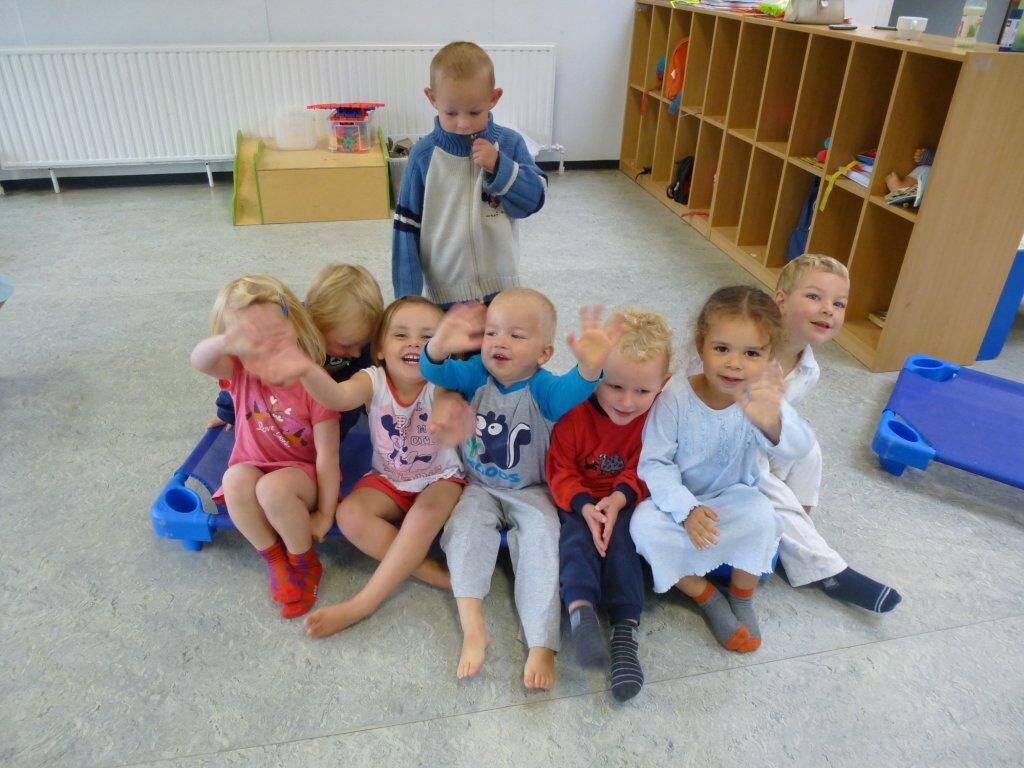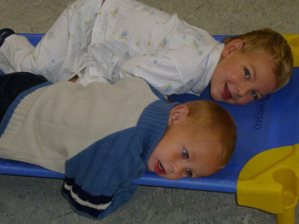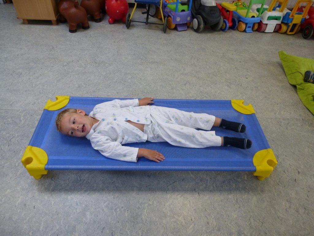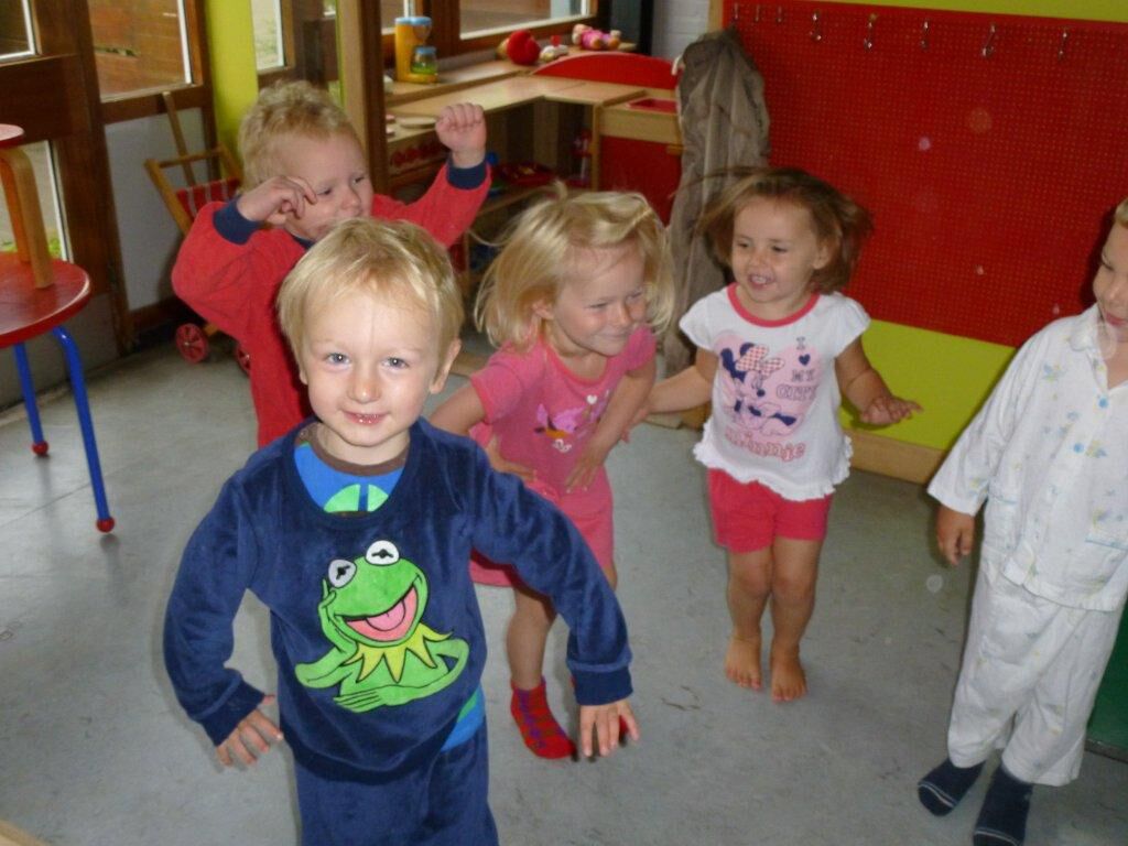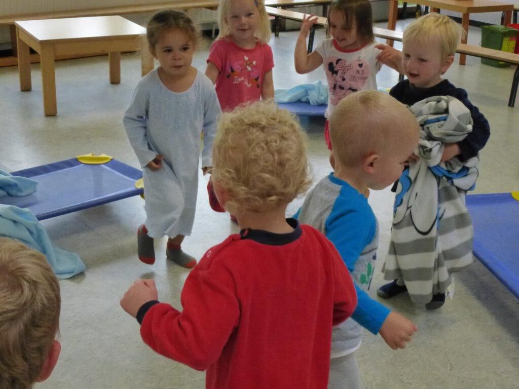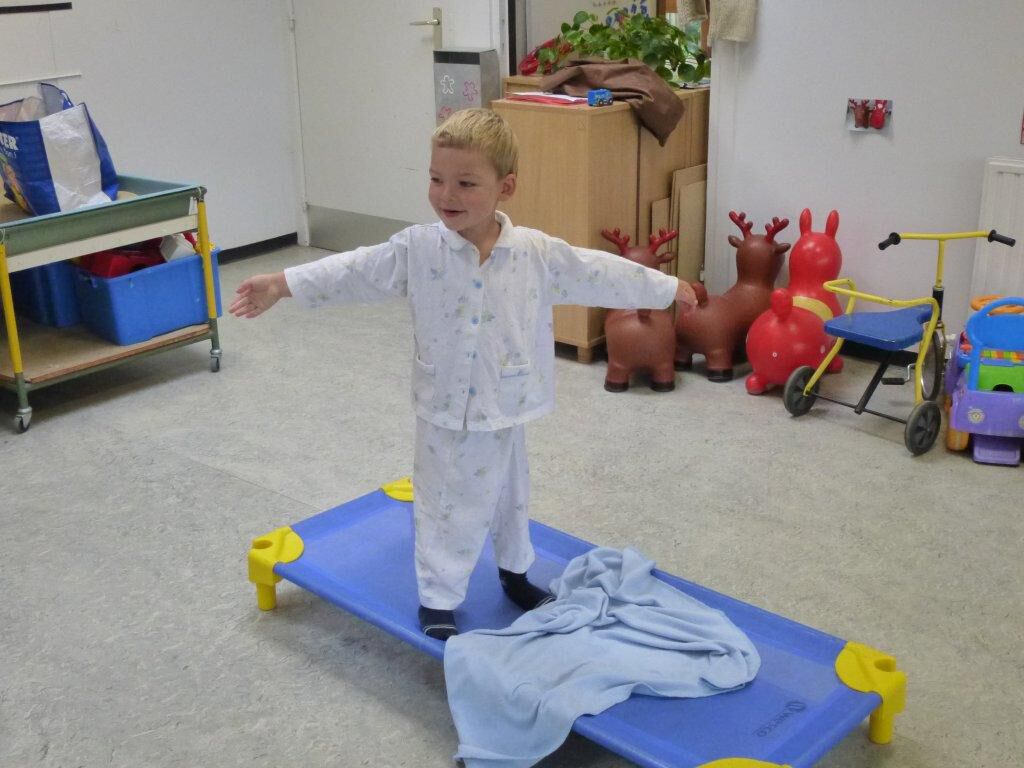 We trekken allemaal onze pyama aan om in de zaal het slaapritueel uit te beelden. We kregen telkens een andere opdracht. (op een bed zitten, op de rug liggen, op de buik liggen, per twee op een bed,......