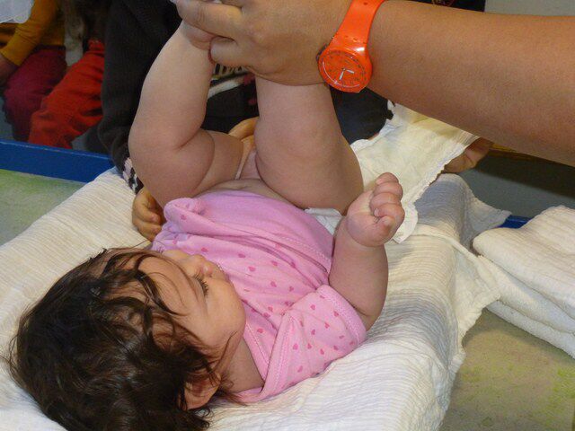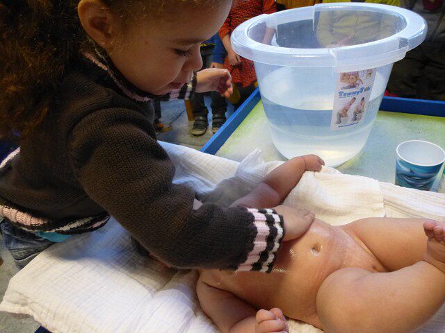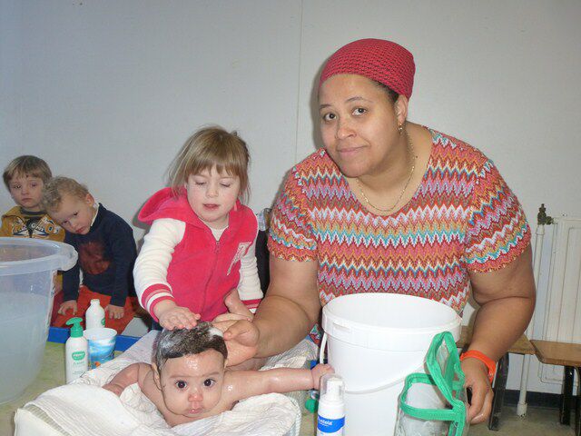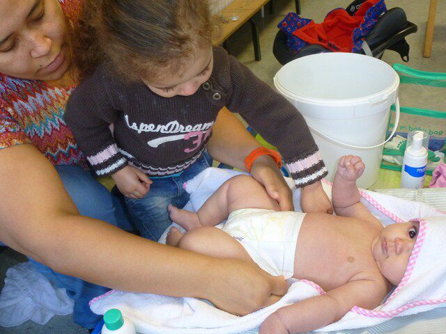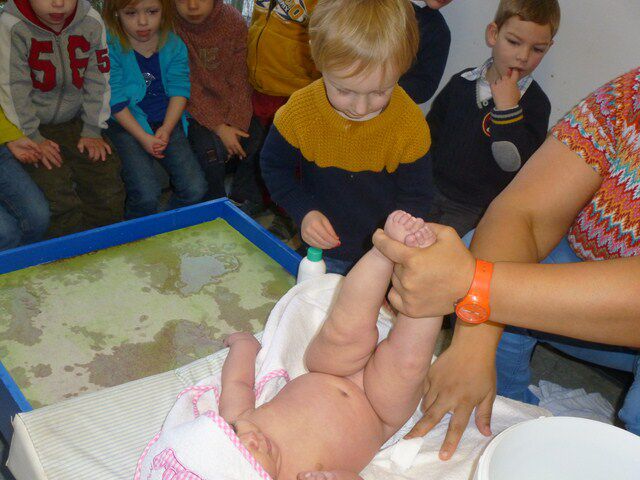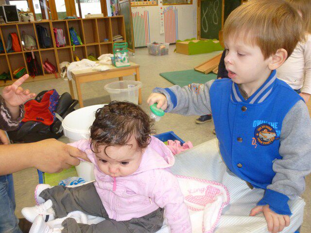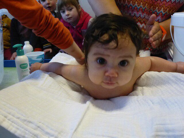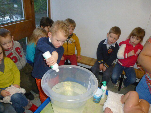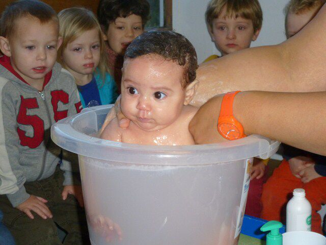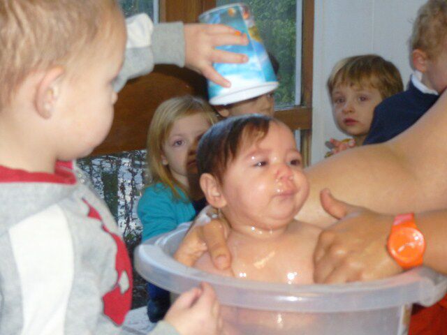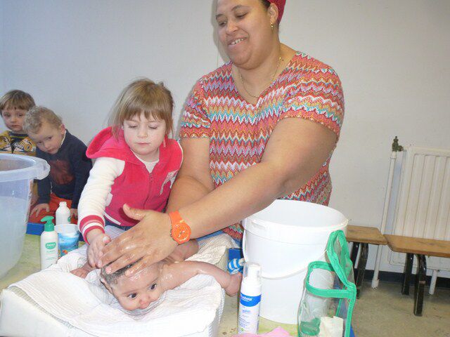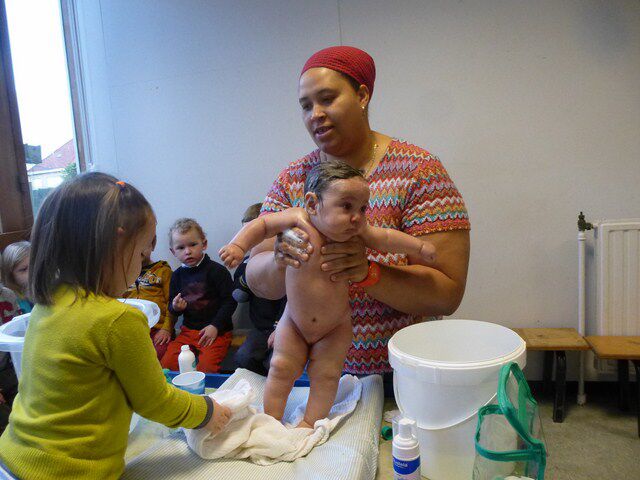 Vandaag mochten onze kleuters helpen om Tiana (het zusje van Elisha) te wassen.