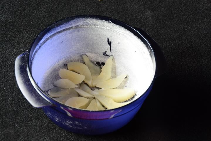 Het deksel eraf halen en koud laten worden in de vorm. Voor het serveren keer je het gebak om zodat de schijfjes peer bovenaan komen te liggen.