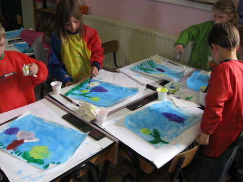 Na een leuke lentewandeling (jammer genoeg vergat de juf haar fototoestel) schilderen we de mooie lentebloemen die we zagen...