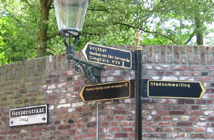Foto 41) Belgisch Consulaat, blijkbaar in handen van Fortis..??.. Foto 42) Henri Van Veldeken en het Luxe Paleis van de Kanunnik op de achtergrond Foto 43) Tegen de kerk aan - in een afgesloten inham - staan twee beelden van klassieke heiligen met een erg moderne uitstraling. Foto 44) De straat overbrugging met bogen aan de achterkant van de Sint Servaaskerk Foto 45) Het klooster van de Liefdeszusters tussen de twee muren met bogen Foto 46) De deur van het klooster van de Liefdeszusters met het bord dat zegt dat ze onder de Heilige Carolus Boromeus resorteren Foto 47) Het naambordje van de "Zusters onder de Bogen"