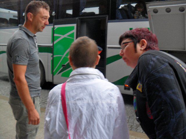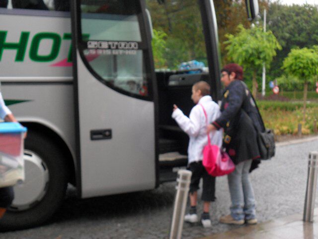 Zoals je ziet het regent hard, toen ze vertrokken, maar eenmaal op de bus, had ons Elke al plezier.