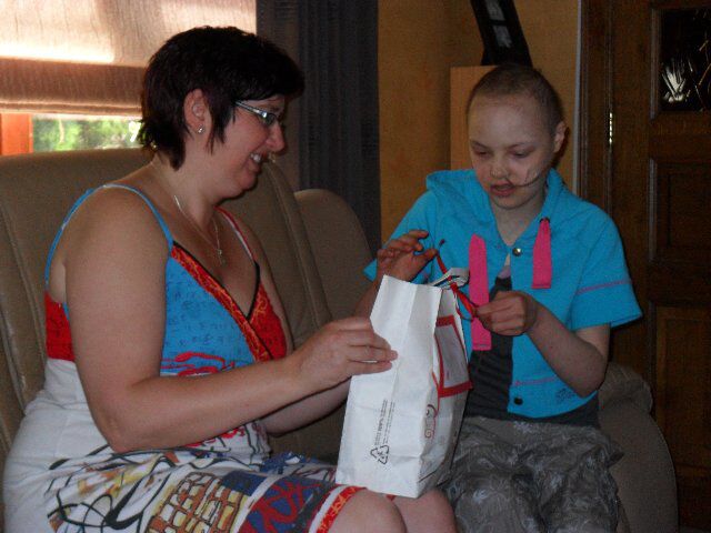 Maandag waren haar plaatjes terug gezakt naar 40.000 maar dit is nog redelijk (als ze minder dan 20.000 zijn dan geven ze bloedplaatjes bij). Haar witte bloedcellen waren 2.7, dus dat is voldoende. Dinsdag voormiddag had ze echter 2 keer een bloedneus en dus heb ik naar Leuven gebeld. We moesten best langskomen. Dus opnieuw richting Leuven. Toen we daar aankwamen waren de bloedplaatjes al besteld. Ze hebben bloed getrokken voor controle en meteen de bloedplaatjes aangehangen. Als ze een bloedneus hebben weten ze al genoeg en zijn de plaatjes gewoonlijk te laag. Een tijdje later waren er de bloedresulaten. Haar bloedplaatjes waren maar 13.000 (deze zouden tussen de 150.000 en 450.000 moeten zijn) dus veel te laag, dus zeker hoognodig dat ze deze bijkreeg. Haar witte bloedcellen maar 0.8 en haar hemoglobine maar 8.6, alle waardes waren dus op 1 dag tijd helemaal naar beneden gezakt. Oorzaak ?? De dokters wisten zelf ook niet goed hoe dit kwam. Ze hebben nogmaals enkele wissers genomen. Vrijdag moeten we teruggaan en dan weten ze ook de resultaten van deze wissers. Gisteren avond heb ik de voeding eerder moeten stoppen omdat ze begon te kokhalsen. Ze heeft al 5 dagen geen stoelgang gemaakt, dus ze heeft ook last van buikpijn. Vandaag is de thuisverpleegster nog even langs geweest en ze heeft met Leuven gebeld omdat het zo moeilijk gaat. Ze heeft thuis een lavement gezet. Dat viel natuurlijk niet mee, maar het moest. Ze voelt zich nu toch al iets beter, minder buikpijn. Er moet echter nog stoelgang volgen, maar tot nu toe lukt dat verder nog niet. Nog even geduld waarschijnlijk. Dus nog verdergaan met forlax geven. De contramal pijnstiller , die ze nodig heeft voor de pijn van haar aften, heeft als bijwerking dat deze zorgt voor obstipatie, dus zo blijven we bezig. Morgen zullen we zien wat de bloedcontrole en de uitslag van de wisser als resultaat geven.