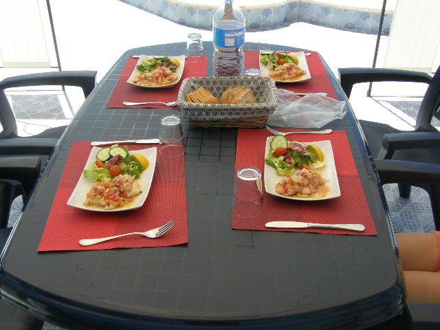 Onze eerste lunch... Merluza in witte wijn met spekjes en sla ...HHHHmmmmm