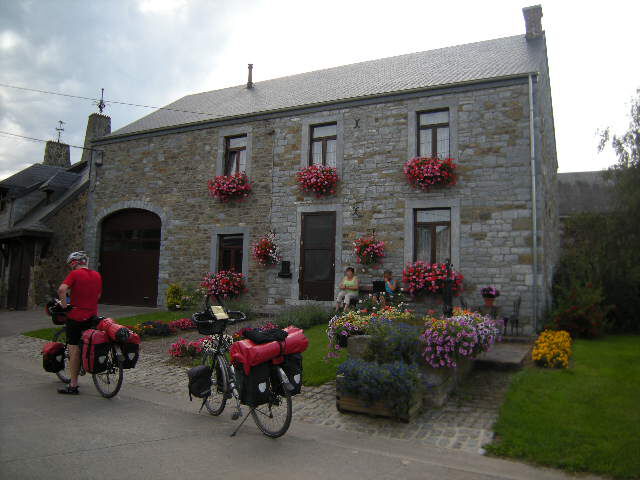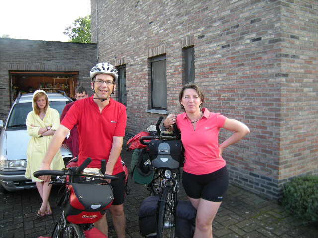 Wij hebben slechts 1 dag regen gehad van 's middags tot iets na vieren, en voor de rest was het warm, om niet te zeggen heet. De eerste dag begon nochtans onheilspellend; opgestaan met gietende regen, maar toen wij naar ons ontbijtadres fietsten (op vriendelijke uitnodiging van Vero's zus) klaarde het al op en toen wij rond tienen uitgewuifd werden, scheen de zon al volop.