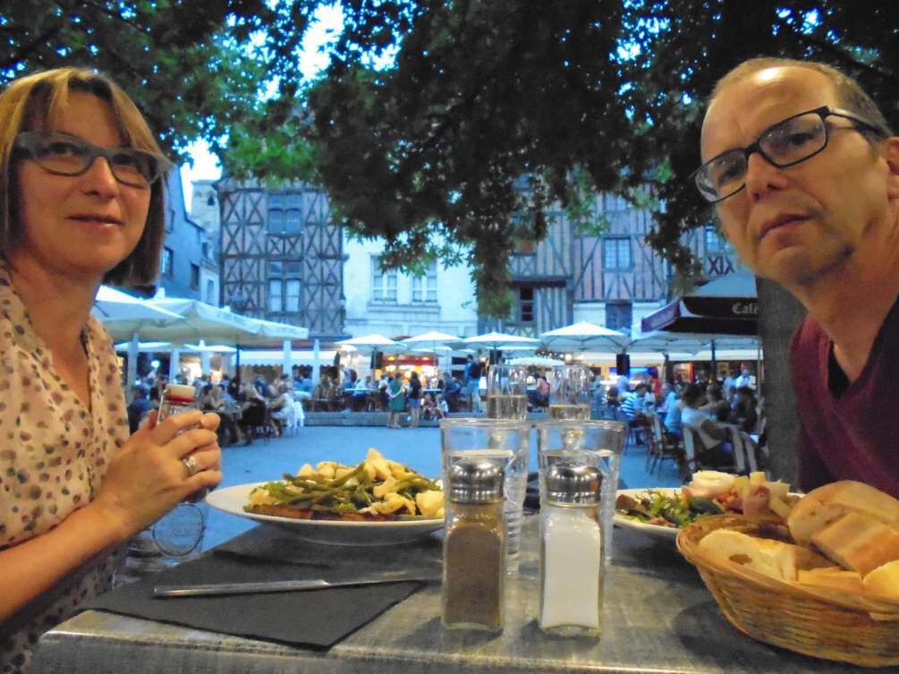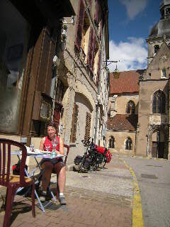 Wanneer wij kamperen, hebben wij 's morgens altijd thee bij het ontbijt, want het was wat te moeilijk om een koffiezetapparaat mee te sleuren. Niettemin hebben wij graag ons kopje koffie, dus vertrekken wij voor een uurtje fietsen, om dan ergens in een café een koffie te gaan drinken. Zo kwamen wij in Gray, en vonden er slechts één zaak open, een crêperie. "Ik zal daar vragen of we een koffie krijgen," zegt Vero, en dit mocht. Nietsvermoedend zette ik me op het terras en bestelde een koffie. Met een achteloze blik op de menukaart zegt zij dan plots: "Oh, hier hebben ze pannenkoeken met suiker voor maar 1,10 EUR, dat kan ik toch niet laten liggen". En zo zaten wij te smullen op een uur dat niet geassocieerd kan worden met pannenkoeken eten...