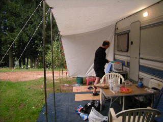 Wij hadden ons geïnstalleerd op een kleinere, gezellige camping op een kasteeldomein in Gibles, naast ons twee VW's met een caravan. Net toen wij wouden koken, begon het te regenen. Met heel ons hebben en houden gevlucht naar een schuur wat verder op het domein, maar de zanderige, vuile grond was niet erg aanlokkelijk om op te eten. Dus toog Vero naar de caravan met de vraag of wij hun stoelen mochten gebruiken. "Ja hoor, maar het zou toch makkelijker zijn als wij daar kwamen koken", zei de man. En dus verhuisden wij voor de tweede maal naar de buren om daar hun fornuis, hun melk, hun tafel en stoelen te gebruiken. Zij gingen wel even een wandelingetje maken... Daags nadien kwam hij zelfs aanbieden om onze banden op te pompen, want als ex-wielrenner had hij hiervoor geschikt materiaal mee!