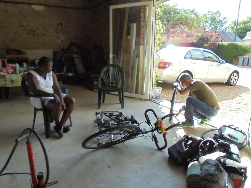 Ook kreeg ze een lekke band onderweg, althans ging de lucht er zachtjes uit en moest ze regelmatig bijpompen. Zij zocht een fietsenmaker in Chartres, maar de weinig commercieel ingestelde fietshandelaar zei haar dat ze twee dagen moest wachten vooraleer hij het kon repareren. Dus reed ze 40 km verder tot Bonneval, waar volgens de gids een andere fietsenmaker was. Daar aangekomen, sprak zij een sportieve man aan om te vragen waar deze was, maar toen bleek dat hij niet meer bestond. Was die sportieve man toch wel een ex-profwielrenner die nu bij de internationale wielerfederatie werkte en net terug kwam van de Olympische Spelen. En dat zo iemand banden kan plakken, is een evidentie.