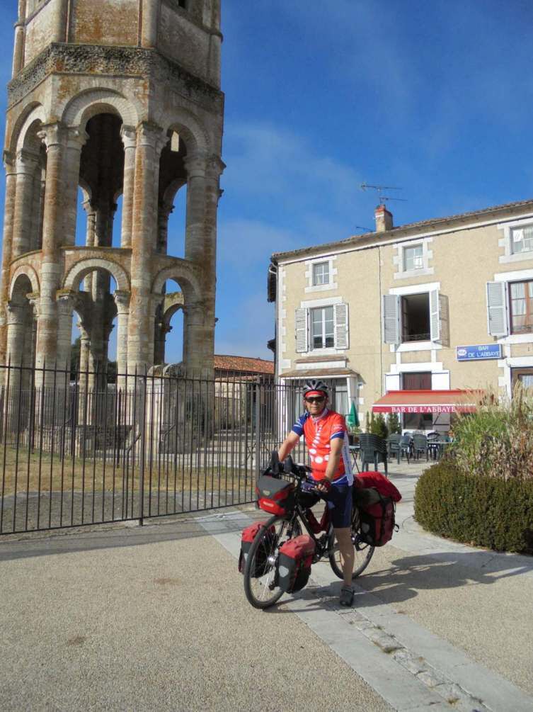 Aan de abdij van Charroux, waar de cafébaas en zijn klanten ons hielpen om een overnachtingsadres te vinden.