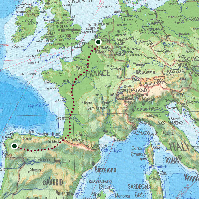 Verschil met de vorige tochten, is dat Vero een stuk alleen zal afleggen, aangezien zij meer verlof heeft dan Jo. Zij vertrekt vanuit Mechelen en rijdt in tien dagen tot Tours aan de Loire, en als alles goed gaat, treft Jo haar daar begin september na een treinreis vanuit Brussel Zuid. De hele maand september rijden zij dan samen de pelgrimsroute naar Spanje. Hopelijk is het dan nog goed weer, zodat Jo niet voor niets met al het kampeermateriaal zeult...