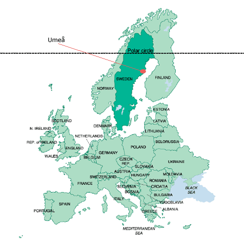 De meesten weten Zweden wel liggen denk ik, Umea daarentegen zullen alleen de aarderijkskundeknobbels weten ;) daarom voeg ik hier een prentje bij zodat jullie ongeveer een idee hebben waar ik sneeuwmannen ga maken :p