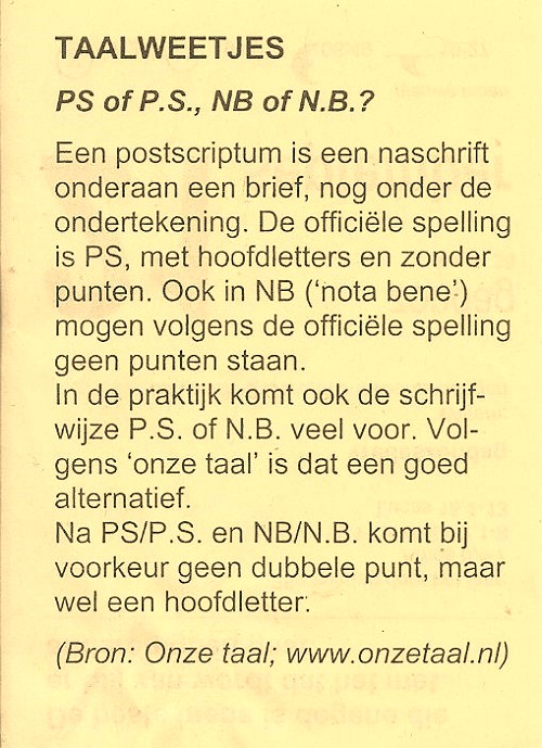 Wat me de laatste tijd opgevallen is dat tegenwoordig het Engels na de lagere school en bij alle vervolgstudies belangrijk is en het Nederlands steeds verder afzakt en een totaal vreemde taal begint te worden. Ook is het me opgevallen dat de banken het liefste klanten hebben die zowel van hun lopende rekening alsmede met betrekking tot hun spaarrekening volledig digitaal gebruik maken van de bankdiensten en sommige lieden hebben aan contant geld geen knoop in hun portemonnee zitten en ook hier op het platteland is het geen pretje om voor een of ander goed doel aan de deur te collecteren. Kom je met een collectebus aan de deur krijg je vaak te horen dat men het bedrag via de bank overmaakt, wat in feite nooit gebeurt. Heel vroeger heb ik in de vijftiger jaren van de vorige eeuw een tijdje als vervanger op de diverse postkantoren in Den Haag e.o. gezeten en bij collectes aan de deur gaf eenieder een contante gift. Toen ik ooit voor een goed doel in Wassenaar aan het collecteren was kreeg ik bij ongeveer 40 procent van de bewoners uit de deftige wijken aldaar te horen dat ze per bank of giro hun gift overmaakten, maar bij controle bleek dat voor 95 % van de bezochte élitaire bewoners dit niet het geval te wezen. Zo, we hebben het even over taalgebruik gehad en iets wat er enigszins aan verwant is, maar men kan ook spreken dat dit het laatste Zeugma is. Staan heb ik iets over het woordgebruik met betrekking tot zwangerschap, bokkenpruik, bazaar en oorlam en als laatste Metonymie en Zeugma. Uw weke massa wordt weer flink verrijkt en in hun Engels taalgebruik mag de moderne jeugd deze simpele Nederlandse taalschat wat mij betreft ook verwoorden.