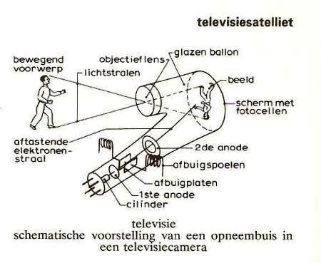 Televisie: Het overbrengen van bewegende beelden met behulp van elektriciteit. Het over te brengen beeld wordt met een lenzenstelsel (optiek) afgebeeld op een scherm, bedekt met miljoenen fotocellen. Een elektronenstraal wordt afgebogen via een elektronenstraalbuis en doorloopt regel na regel deze fotocellen. Daarbij ontstaat een stroomimpuls, evenredig met de belichting van elke cel. Het beeld wordt aldus omgezet in een snelle opeenvolging van stroomstoten. De versterkte stroomstoten worden voorzien van een code die aangeeft hoe snel de regels worden doorlopen. Dit gecompliceerde elektrische beeld kan via een kabel of gemoduleerd op een draaggolf via een zender naar een ontvanger worden gebracht. In de beeldbuis van de ontvanger wordt een elektronenstraal afgebogen (op dezelfde wijze als in de camera) en doorloopt regel na regel een lichtgevend scherm. De intensiteit van de electronenstraal (en daarmee de oplichtende punten op het scherm) wordt geregeld door de oorspronkelijke stroomimpulsen. De opbouw van het totale beeld duurt 1/25 seconde; dat is zo kort dat ons oog deze na elkaar optredende lichtflitsen op het scherm van de beeldbuis ervaart als gelijktijdig. Wat ik hier opgetekend heb kunt u het beste bekijken en begrijpen met onderstaande schematische voorstelling van een opneembuis in een televisiecamera en daarop ziet u de hele beeldwandeling die naar de kijker wordt overgebracht. Begrippen: Een elektronenstraalbuis is een apparaat die dient om de snelheid van de elektronenstralen zichtbaar te maken. Elektromagnetische golven: Dan hebben we het over de verspreidingswijze van elektromagnetische energie in de ruimte.