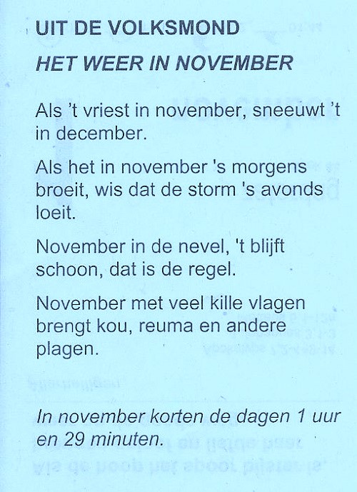 Er is de afgelopen weken weer veel veel gebeurd en en gelukkig is tot op heden nog niet uitgekomen wat door bekende helderzienden is voorspeld. Weliswaar ben ik geen ziener, maar wel iemand die veel onderweg is geweest en veel mensenkennis heb opgedaan waardoor je vaak meer in de gaten hebt dan iemand die de hele dag achter zijn bureau zit en wat je eraan overhoudt zijn vaak sterke voorgevoelens die werkelijkheid worden. Vroeger was er een gezegde die zei: ,,Wat daar voorgevallen is, voelde ik al lange tijd met de klompen aan al zien gebeuren!" Er waren wereldwijd op de voetbalvelden hevige schermutselingen, in Noord-Afghanistan was er een zware aardbeving met veel gewonden en doden en overal grote schade aan gebouwen. Ook iidividueel waren er her en der familietwisten waarbij doden en gewonden vielen en in een of ander huis werden zelfs lichamen van een achttal doden gevonden. In Oekraïne zijn de schermutselingen in de strijd met Rusland totaal uit de hand gelopen en over vrede en wapenstilstand wordt niet meer gesproken en mogelijk loopt alles uit op een dreigende kernoorlog, waarbij vermoedelijk ook Nederland volop betrokken raakt. Staan heb ik ook weer wat leuke dingen en wel over de saxofoon, een gedachtegang dat de Romeinen uitsluitend witte beelden maakten, maar dat is in werkelijkheid niet zo, verder iets over het weer in november en wat velen niet weten dat de naam echo afkomstig is van een Godin, die door een godin in een hogere orde recht gezet werd. Vermaak u ermee en weet dat wat er ook gebeurt het leven gewoon verder gaat!