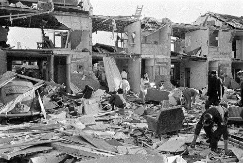 Foto van huizenblog in het Betuwse Tricht totaal vernield door windhoos d.d. 25-6-1967