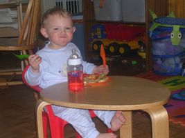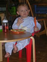 Ik ben vandaag 22 maanden oud se... wat gaat de tijd toch snel hé! En ik ben echt een flink ventje aan't worde, al zeg ik het zelf Heb eigenlijk een beetje groot nieuws ook, ik ben gistere voor de eerste keer op het potje geweest Het was wel lache voor mama, ik zei dat ik pipi moest doen en mama begon natuurlijk weer over 'op het potje gaan'. Alé heb haar dan na zoveel tijd eindelijk haar zin maar eens gegeven... En jaja ben flink op het potje gaan zitten, tot mama richting keuken ging Dan kwam ik ook van het potje en ja ik was natuurlijk nog pipi aan't doen, dat had ik even nog ni door Ons mama maar lache en ik verwonderd naar men piemeltje kijken, tja ni aan te doen hé ons mama kon dweilen Met men eten ben ik ook ne flinke vent hoor... ik doe ni liever dan lekker eten En tegenwoordig mag ik van mama zelfs aan men eigen tafeltje zitten en net als de grote mensen met mes en vork eten. En dat lukt me al aardig hoor, je moet hier maar is zien. Flink hé! Jaja kleine Yuni wordt een groot ventje Alé ik ga een lekker dutje doen nu want ik viel daarnet al in't slaap toen ik in het karretje zat in de winkel. Heb weer zo hard in de tuin van Marina zitte ravotte dat ik echt bekaf was. Ik kon me echt ni meer wakker houden, ik had in de winkel van Marina een vleesje gekregen, want als we daar kome legge die me altijd in de watte... maar ik moest het snel opeten hoor, kon echt men oogjes ni meer openhouden... en die vrouwe maar gibbere met mij. Dus nu ga ik lekker naar dromenland zodat ik morgen weer in grand form ben hihi Slaap wel allemaal x