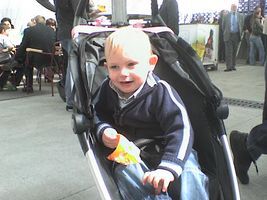 Zaterdag was het weer een superleuke avond. Na een heel lang middagdutje zijn we richting Antwerpen getrokken. Weer een héél fijn avondje sinksenfoor. Geweldig was dat!!! Eens daar hebben we eerst lekkere frietjes gegeten, want we hadden allemaal héél veel honger... en smaken dat dat deed. Heb ondertussen ook iets nieuws geleerd, na het eten was het drinken en voor het drinken was het "schol" zeggen. Plezier dat ik daarin had, maar voorlopig nog even oefenen met bekertjes en plastiek flesjes want een glas zou ik nog wel eens stuk kunnen proosten hihi... En dan was het plezier maken... Eerst hebben we alles een beetje afgezien en van het ideale weertje genoten, want eigenlijk was het een aangename zomeravond. Ik genoot dus met volle teugen vanop de eerste rij, vanuit mijnen buggy dus hihi... En ja natuurlijk heb ik veel op de kermis mogen zitten, het is maar één keer sinkenfoor en daar heb ik dan ook volop van mogen genieten. Mama begint zo stilaan minder bezorgd te zijn en me meer en meer te vertrouwe dat ik ne grote vent aan't worde ben. Dus ik heb zo eens wat anders mogen doen dan gewoon op de kindermolen te zitten. Eerst ben ik op safarietocht geweest met de auto's, plezant zenne, rijden met de auto's tussen de palmbomen. Na men eerste ritje gingen we weer even verder.. En ja als ik zo moet stoppen laat ik altijd even van me horen, maar dat is altijd snel voorbij en is iets dat ik nog moet leren, maar met verloop van tijd zal dat wel lukken. Daarna ben ik gaan vliegen, mama wist het eerst nog niet zo goed, bezorgd weer, maar toen ze zag dat ze mij kon vasthechten in die molen heeft ze me toch één vlucht gegunt... hihi en fijn dat ik dat vond, ben wel maar één keer de lucht in gegaan want wist nog ni zo goed hoe ik dat ding moest bedienen, maar vond het sowieso al een superleuke ervaring... Daarna ben ik nog eens op de gewone molen geweest, was zo euforisch dada aan't doen dat ik toch ni pardoes uit den tuut viel zeker, maar niks aan de hand hoor, geen builen, geen schrammetje, niks pijn, alleen ja iedereen had mij weer eens gezien hé hihi... Ons mama stond ook rap bij mij, maar kon er gelukkig om lache want het kwam ni echt door mijn apenkuren en had me ook helemaal geen pijn gedaan! En daarna kwam de grote lekkernij, we hebben een wafel met aardbeien en héél veel slagroom gegeten... lekker lekker!!! Ik ben dan samen met mama nog in een snelle molen geweest, plezant hoor zo eens iets samen met mama doen. Het was wel een snelle molen maar ik dierf het wel en vond het met momenten echt wel plezant, maar zonder mama zou ik het ni durven denk ik... dus thanks mama want dit heb ik ook weer eens mogen beleven. Dan was het nog even plezier voor de grote kinderen onder ons... hihi Johan en mama hebben nog een beetje in het lunapark rondgehangen en het schietkraam... en dan was het echt tijd om huiswaarts te keren want het was wel echt laat...