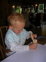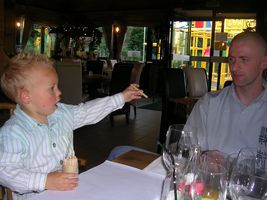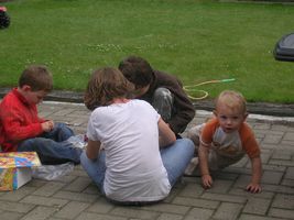 En zondag, wel dan was het een dagje feest! Feest voor de kids, feest voor de mama's en feest voor den bompa aan't zee'ke. Ons mama die viert vaderdag op 19 maart, mss omdat ons vake den dag ervoor verjaart... In ieder geval bij de maatjes aan't zee'ke was het dus vaderdag, dus aan alle papa "een fijne papa'dag"!!! Wij hebben een ganse dag leuke dingen gedaan, ofwel was het lekker eten mm... ofwel was het heerlijk spelen... Na onze kusjes en goeiendagskes ben ik samen met Janos en Liesje met de tuut'en gaan spelen,tv gekeken en daarna lekkere frietjes gegeten, en de mama's mmm lekker scampi's. En zo waren we allemaal goed op krachten om te gaan wandele in het park, een ijsje te eten en een beetje te spelen. We hadden er wel geen rekening mee gehouden dat er thuis ook nog dessert stond... dus jaja eens thuis van het park was het lekkere taart smullen, want den bompa had een ohh zo'n lekkere taart gekregen. Terwijl we dan gaan ravotten zijn in de tuin en vooral op de rijsaf, hebben bompa en de mama's den afwas gedaan en nog wat aan de laptop zitten prutsen... Tegen het avondeten, zagen wij kapoenen zo zwart als iets, maar hadden ons héél goed geamusseerd samen... Hebben nog een beetje flink aan tafel gezeten voor de kaasschotel. Jaja en daar is mama wel een beetje gek op, dus ze kon geen pap meer zeggen, zo lekker had ze gesmuld Zodus allen voldaan want eens in de auto had ik geen minuut nodig of ik lag zoet in dromenland...