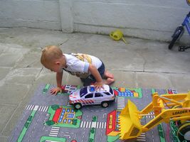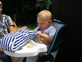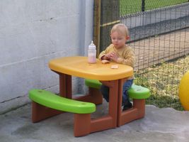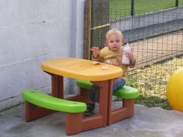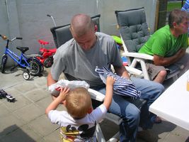 Zondag was het dan weer feest!! Vorige week met men verjaardag hadden meter Allessandra en peter Gio nog examens, dus wij hadden afgesproken dit weekend een feestje te houden. En ja hoor ook dat was weer reuzefijn. Het was weer supergoed weer buiten en dat is altijd veel plezanter, zo konden we gezellig buiten in de tuin zitten. Ons mama had me eerst nog even in men bedje gelegd, en toen ons vake, moeke, mémé en pépé er waren is Johan me uit men bedje komen halen. Maar het duurde even voor ik wakker was en besefte dat er cadeau'tjes op mij aan't wachten waren om opengemaakt te worden. Maar eens ik goed wakker was heb ik genoten van men feestjes. Ik heb superleuke cadeau'tjes gekregen, ik ben de laatste tijd echt gek van auto's en heb dan ook een paar nieuwe auto's gekregen en 2 matten met autoparkoers op... daar ga ik me mee amuseren! Verder heb ik nieuwe zomerkleren gekregen, superchique en een ganse reeks boxershorts... mja ja dat hoort bij groot worden hé de overgang van babyhemdjes naar boxershorts voor de echte grote rakkers en ikke fier... Maar men oog viel vooral op men speelgoed dat ik gekregen had hoor, daar ben ik gelijk mee beginnen spelen, dus heb mijn plezier er al aan beleefd. Dan was het lekkere taart eten, en ja kaarsjes uitblazen was er weer niet bij want deze keer was de wind me voor Taart eten kan ik ondertussen ook al flink alleen maar het was vooral slagroom eten... mmmm lekker hé! Na al dat lekkers was het nog een beetje spelen en ons amuseren met wat confetti, dat vond ik ook weer superfijn! Thanks allemaal... ik heb genoten van men feestje en voldaan men bedje ingekropen x