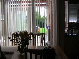 Voor de nieuwsgierige onder jullie hebben we hier eindelijk een paar kiekjes van ons nieuwe stekje. Ondertussen is alles hier zo goed als in orde en hebben we allemaal onze draai gevonden. Als Johan onze nieuwe lamellen aan de ramen aan het hangen was ben ik met mama te voet naar de winkel geweest. Dat is wel makkelijk nu want de winkels zijn hier vlak achter het hoekje. En toen ons mama de boodschappen dan weer aan het wegzette was en iets later voor het eten zorgde heb ik nog wat buiten gespeeld met de kindjes van bij de buren. Dan was het eten en beddenbak in voor een tukie. Mama kon eigenlijk nog héél wat doen, maar ook zij heeft zo stilaan haar klopje van de verhuis, dus uiteindelijk heeft iedereen een middagdutje gedaan hier thuis. Jaja ook Johan dus, want toen mama rond half 4 wakker werd en haar ventje in de garage wou opzoeken vond ze hem uiteindelijk languit op het bed Iedereen goed geslapen dus dat mag ook eens. s'Avonds hebben we dan bezoek gehad van Johan's beste maatje en zijn we lekkere frietjes gaan halen mmmmm.... lekker lekker De grote mensen hebben nog wat gezellig zitten kletsen en ik, wel ik kruip nu men nestje in want morgen is het weer vroeg opstaan want we gaan naar de tuta's kijken. Slaap wel allemaal x