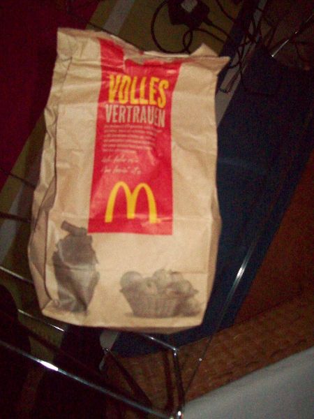 Bij het buitgengaan van het loket merkte ik nog iets heel leuks op, een MacDo! "Jippie" dacht ik bij mezelf, en kon het niet laten om 2 cheeseburgertjes te kopen . Thuisgekomen liet ik me deze zeer smaken Aangezien ik reuzehonger had, en nog wel iets kon eten, besloot ik om m'n mini-frietketeltje eens te gebruiken en wat frietjes met een mini-loempia'tje te bakken Leuk ding, dat kleine frietketeltje. Alleen wist ik niet dat er zoveel kracht in zat De frietjes waren lekker, maar hadden een beetje lang ingelegen (Noot aan zelf: volgende keer beter opletten tijdens het frietjes bakken) .