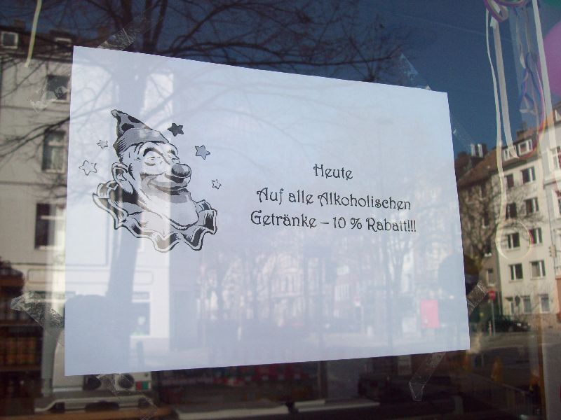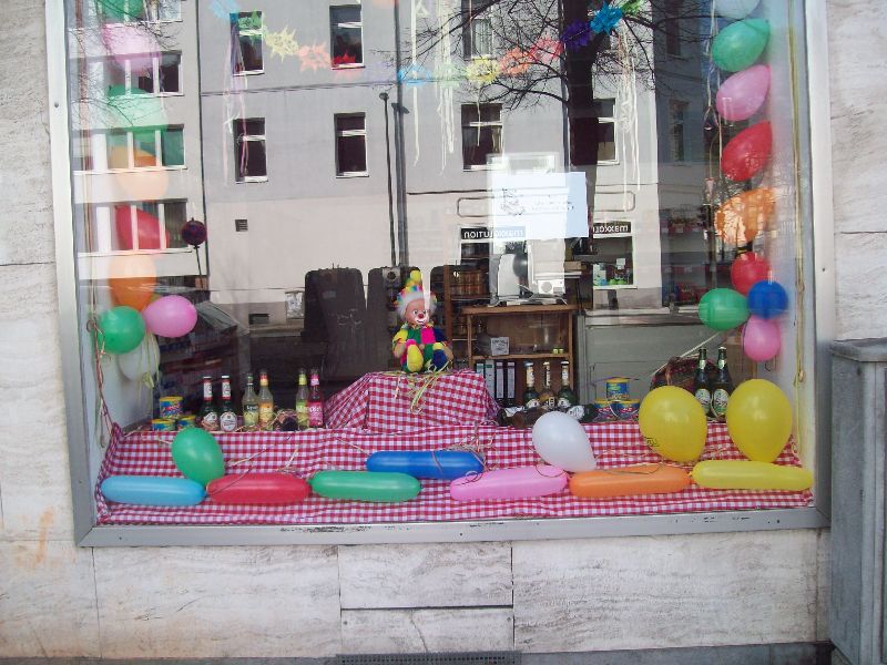 Wachtend aan m'n bushalte zag ik een vrolijk versierde bus toekomen, mijn bus! De superlieve vrouw waarmee ik al elke dag meegereden was om dit uur, was blijkbaar ook al goed in feeststemmming. Ze had haar bus versierd met serpentines en een clowntje, en was zelf ook verkleed. Haar groene haarband met dito groene bloemetjes zwengelden heen en weer als ik haar begroette en m'n kaartje betaalde . Een bijpassende knalgroene trui en assortie nagels maakten het geheel af tot een leuk plaatje Ik kon het niet laten om haar een complimentje te maken en zei: "Sie sehen so Hübsch aus". Ze lachte vrolijk en zei met een grote glimlach: "Oh, danke schön" .