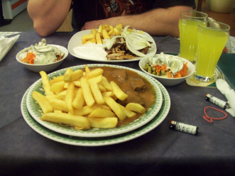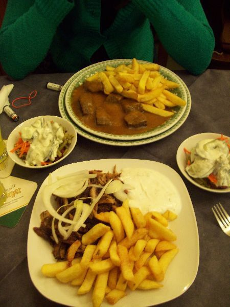 Ik weet niet waarom, maar ik was ongelofelijk zenuwachtig toen hij sms'te dat hij bijna bij mij was. Ik denk dat dat de afstand is, en het lange niet zien van elkaar . Ik moet eigenlijk wel toegeven dat ik heeeeel erg blij was dat'k hem zag . Hij ook wel, want hij gooide met complimentjes da het niet normaal was . Hij had nog een extra lading van thuis bij (soep en cake van de mama, wat kleren, ...), en na dit alles uitgepakt te hebben en wat bijgepraat te hebben, besloten we om iets te gaan eten. (Sorry mam, voor al het eten da je meegegeven had voor die dag, maar ik had er eens nood aan om iets te gaan doen met z'n twee) We besloten om m'n straat eens door te lopen, en kwamen bij een Grieks restaurantje uit.