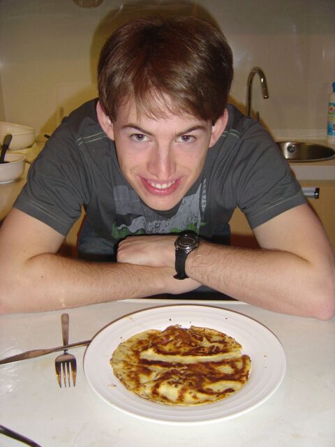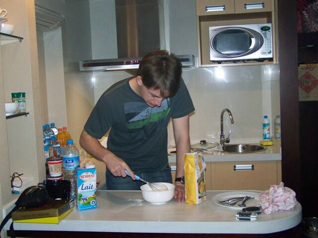Op het appartement beginnen we onmiddellijk met pannenkoeken bakken. Na enkele probeerseltjes, toevoegen van een geheim ingrediënt en wat aanpassen van het vuur, tovert Tone opnieuw prachtige en overheerlijke pannenkoeken op tafel. En zoals een echte kok hebben we geen spatel nodig om de pannenkoeken te draaien, maar maken we gebruik van een goede polsslag (we zijn niet voor niet basketters :D) Terwijl Tone aan de pan staat, probeer ik de juiste manier te vinden om chocoladesaus te verkrijgen en snij ik het fruit voor de andere gerechtjes. One team and a little mercy in the kitchen