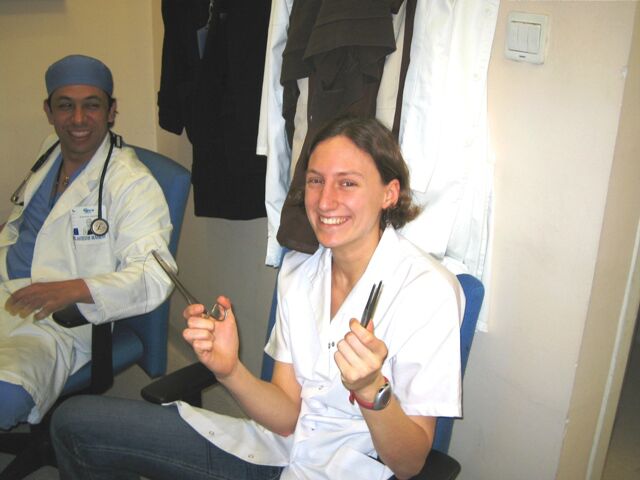 Ik vul mijn voormiddag met afwisselend consultaties bij Dr. Song en Dr. Maskay en vlieg hierbij van het één naar het ander. De 2 opmerkelijkste patiënten waren een meisje van 7 maanden en een vrouw van middelbare leeftijd. Bij het koddig babytje was het achterdeel van de oorring helemaal in het oorlelletje gegroeid. Toeval lukt nu dat die mama getrouwd is met een Belg en dat ze behoorlijk goed Nederlands kan spreken (echt sjapoo, zowat 5 jaar geleden heeft ze voor 2.5jaar in België gewoond en je hoort wel dat het nederlands niet haar moedertaal is, maar der zouden der veel allochtonen een voorbeeld aan kunnen nemen zonder ook maar enigszins racistisch te zijn). Tolk Famke mag dus optreden, want haar Engels is iets minder goed dan haar Nederlands Het leuke aan die hele kleine kindjes is dat je ze mag pijn doen (in dit geval om dat stuk van de oorring te verwijderen) en dat ze 5 minuten later weer aan het lachen zijn naar jou. Ooohh mijn hart lag in een 1000tal stukjes!