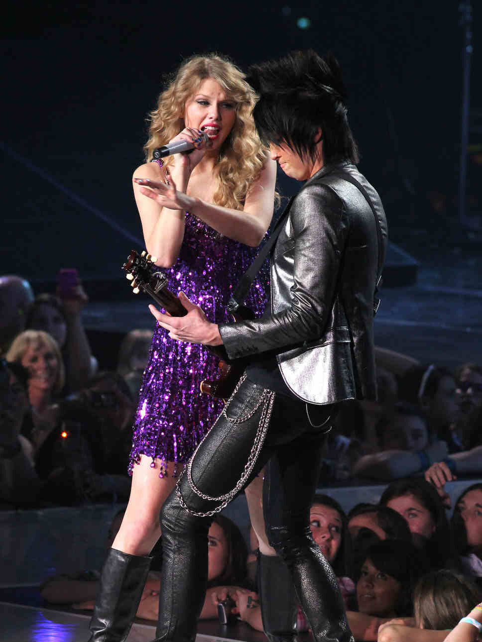 Taylor in een coole zwarte jurk met een metal belt. Hot hot hot!