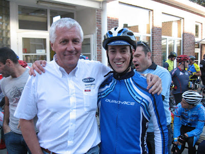 Net zoals vorig jaar stonden we om 09.00 uur aan de start. Opvallend minder volk vandaag ondanks het mooie weer. Weliswaar nogal fris zo vroeg maar we mogen niet klagen als de zon dan toch eens schijnt deze dagen ! De mannen van Meerijeniezere waren ook paraat, de vrouwenclub van Knokke was er ook met een hele groep. De nep 'Eddy Merckx' was ook weer van de partij en nog een paar bekende gezichten deden weer mee zoals vorig jaar. Er waren renners van Quick Step, Gert Steegmans was wel paraat zoals vorig jaar en ook Sebastien Rosseler en Kevin Seeldraeyers. Maar blijkbaar zat de koers van gisteren nog in de benen want ze hadden niet veel zin om voorop te rijden. De start werd gegeven rond 09.30 want die mannen komen altijd wat te laat he. Er reed een auto op kop en die mocht uiteraard niet voorbij gestoken worden, enkele moto's reden van achter naar voor om telkens de kruispunten af te zetten. Het grote verschil met vorig jaar was dat de Quick Step renners niet aan kop reden. Hierdoor en ook omdat er minder volk was, was het veel minder drummen om vooraan te blijven en verliep de rit in het algemeen heel goed. We waren nog niet ver weg toen er weer iets scheelde met Bruno zijn achterband. Met het gedacht dat het leed wel vlug verholpen zou zijn reed ik door met de kopgroep en de mannen stopten. Jo gaf zijn fiets aan Bruno en zei dat hij moest doorrijden want hij dacht dat de buitenband eraan was. Maar na nog eens goed te kijken bleek de band er gewoon af te liggen door te hard op te blazen misschien.... dus wat gelost, band er terug op en hij was nu op achtervolgen aangewezen.....maar wat was dat ver alleen! Bruno haalde dus kopgroep terug in aan 45 en 50 per uur en zag zo rood als een tomaat toen hij naast mij kwam rijden, gelukkig had hij wat hulp gehad van een landbouwkrediet rennen en op de grote baan kon hij dan eindelijk de grote massa voorbij en ook de jeep met Patrick Lefevre. Wij reden ondertussen met het gedacht dat Jo naar de auto was en twijfelden om terug naar Tielt te gaan of na de bevoorrading naar huis zodat Jo niet hoefde te wachten. Het parcoer aan de Edelaere vond ik maar niks met al die kasseien en met dat klimmetje erbij had ik het wel even moeilijk om de kopgroep te blijven volgen. Ik raakte wat achterop maar dankzij wat hulp van Bruno raakte ik toch niet te ver en haalden we nog net achter de Jeep de bevoorading. Daar aangekomen lazen we het berichtje van Johan dat het gelukt was met de band en dat hij via binnenwegjes naar de bevoorading zou komen. En ja hoor, we waren er nog geen 3 minuten of daar kwam hij aan. Ondanks dat hij alleen moest rijden tegen de wind, omleidingen en wegversperringen had en zelf de weg wat moest zoeken had hij die 38 km eigelijk in 'no time' gereden, de krak ! Bij de bevoorrading mocht Bruno even mee op de foto bij Patrick Lefevreen de Quick Step mannen. En daarna was het weer fietsen geblazen....Bruno was weer mee met de kopgroep en die hebben we pas terug gezien in Tielt. Hij vond het gevaarlijker dan vorig jaar, mede omdat de 'Elite' niet het tempo uitmaakten en er andere toeristen op kop reden die er soms een koers van wilden maken. Zijn gemiddelde was wel hetzelfde als vorig jaar, dus aan het tempo lag het niet, wel de kopmannen dus, haha. Bij mij ging het bij de start van het 2e gedeelte echt even helemaal niet, het laat gaan slapen deze week was niet zo slim. Maar van terugkeren mocht ik niet spreken want mijne kopman wou er niet van weten. Al wou ik hem graag het plezier gunnen om eens mee te rijden met de kopgroep, hij hield zijn benen stil en wachtte op mij. Van duwen wou ik niet weten maar hij veegde zijn voeten daaraan en ja hoor....hij kent mij als geen ander......even later kwam ik er terug door. We pikten aan bij enkele mannen, Eddy van Meereijeniezere kwamen we tegen en reed even met ons mee, ook de andere Eddy kwamen we terug tegen....we reden een tijdje met een stuk of 8 a 10 man. Er was niet echt een samenwerking, dan reden er eens weg, we haalden ze terug in....2 reden ginder op de baan, anderen op het fietspad....Om een lang verhaal korter te maken, op Tiegemberg reden we aan 17 a 18 km/uur omhoog, ik zat in ene zijn wiel en gelukkig gaf jo me een klein duwtje als ik het moeilijk had. Eenmaal boven waren we nog met 3. Oef, vanaf nu was het plat.....na een hele tijd haalde ons nog eentje terug in die ervoor ook in ons groepje zat. En met 4 zijn we blijven doorrijden, Jo heel de tijd op kop ! Heel sympathiek was dat een van de mannen naast hem kwam rijden en een schouderklopje gaf om hem te bedanken. Ook de ander was dankbaar en sympathiek en kwam een tijdje babbelen. Ook leuk voor mij want kreeg veel bewondering voor zo een 'sterke madam' haha, al had de madam ferm zere benen op het einde ! Maar we hebben het weer gehaald en al doet het soms wreed zeer om het moment zelf....achteraf geniet je er zo van!!!!En voor ene keer en om ons seizoen een beetje af te sluiten aten we toch wel nen braadworst en dronken we ne Leffe ! Miljaar zeg! Afstand: 96 km