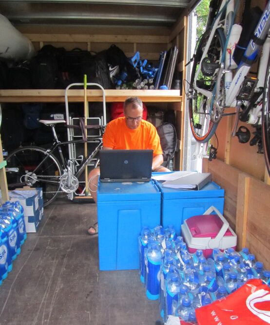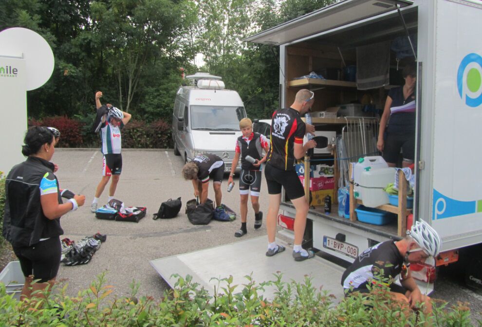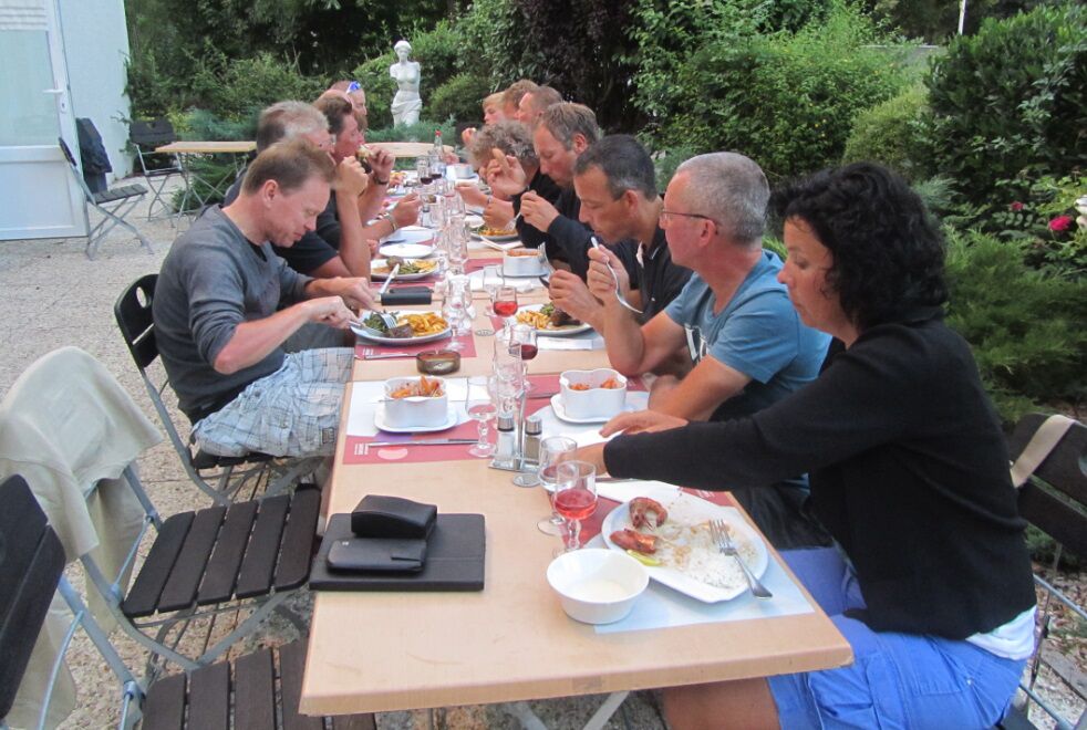 Hallo allemaal, dag 3 dient zich aan. Gisteren nog "genoten' van het diner op het terras: porties waren wat klein voor al die hongerige magen... maar doordat er een starters-buffet was en achteraf ook nog een dessert buffet werd veel goed gemaakt. Trouwens wie van ons heeft dat ene eclairtje opgegeten ? Iedereen de nacht goed doorgekomen, we hadden allemaal 2-persoonskamers uitgezonderd Patrick, Giel en Peter hadden er één van drie. Echter bleek dat juist dezelfde kamer te zijn met één matras op de grond. Organisator Bartel offert zich dan natuurlijk weer op en voelde zich deze morgen alsof hij de nacht in Auschwitz heeft doorgebracht. Het ontbijt-buffet was dik in orde want Linda wist zelfs niet wat kiezen. Het is ondertussen al ruim 8u gepasseerd en de fietsers hebben hun eerste kilometers er weer opzitten. Het logistiek team prepareert zoals elke morgen de vrachtwagen.... GPS'en roadbook klaarmaken, nog snel het thuisfront op de hoogte stellen en dan gaan zij ook vertrekken op zoek naar de eerste bakker (het middageten moet immers ook al voorbereid worden). Nog even wat info voor de fietsfanaten: gisteren was een overgangsrit van 173 km en 1600 hoogtemeters. Ze hebben 6u55 op de fiets gezeten en hadden een gemiddelde van 24,3 km/h. Vandaag rijden ze door de Vogezen met als voornaamste 'bergjes' de Col de la Grosse-Pierre (955 m hoogte, 8,7 km lang en een gemiddeld stijgingspercentage van 3,4%) en de Col du Ballon-d'Alsace (1178 m hoogte, 9,6 km en gem. stijging van 6,5%). Het weer ziet er alleszins weer goed uit want men verwacht weer veel zon en temperaturen van boven de 25 graden. Tot straks allemaal.