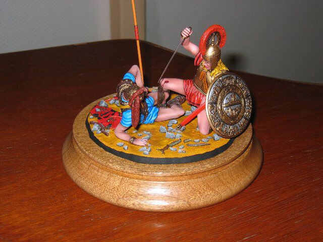 Le combat ; 90 mm. Un diorama de la bataille entre les Grecs et les Romains à Pallante, 8ème siècle avant JC. Lhistoire de Rome est représentée sur le bouclier du guerrier romain. Cette pièce a été très difficile à réaliser à cause de la position des figurines.