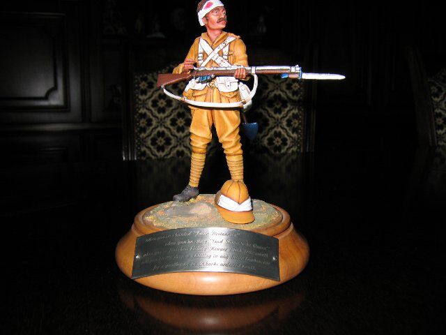 Gentleman en Khaki ; 90 mm. Ces volontaires anglais se battirent pendant la guerre du Transvaal en 1880-1881 et en 1899-1902 en Afrique du Sud. Cétait une guerre entre les Britanniques (les descendants des colons britanniques) et les Fermiers (les descendants des colonsNéerlandais). Cette figurine a été réalisée en honneur aupoème de Kipling "Le mendiant distrait". Le poème est représenté sur le socle.