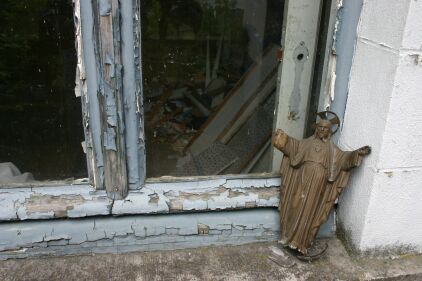 Ik ging verder de fabriek in, er stonden hier ook houten karretjes met gekleurde bobijnen in en aan een muur een oude vergane kalender nog altijd op de datum dat iedereen hier verdwenen was. Hoe verder ik ging hoe donkerder het werd. De typische sheddaken, de dakkapelletjes waren zo vuil dat er weinig licht doorviel. De volgende deur door. Hier stonden nog inox ketels, een oven, electriciteitskasten, vaten, alles bedolven onder een dik laag stof. Overal lag glas van de kapotte ramen, vandalen hadden hier ook de weg gevonden. Hoe dieper ik dit verlaten gebouw binnendrong hoe stiller het werd, hoe dreigender de sfeer me leek. Helemaal aan het eind van de fabriek zag ik letterlijk het licht. Achteraan waren vensters en een openstaande dubbele deur die uitkeek op een verwilderde koer. Overwoekerd door planten, onkruid. Daar op het eind stond een soort bureau, een vorm van administratieve ruimte omgeven door vensters en veel glas. Binnenin was het één rommelboel van achtergelaten papier, bestellingen, facturen, folders, kaften en mappen. Alles verspreidt op de tafel en op de vloer. En net als ik me omdraaide om weg te gaan zag ik hem hangen. Een oud portret in bruine kleuren van een man in ouderwets kostuum. Hij keek me recht aan. Was hij een belangrijk persoon, directeur of eigenaar van deze voormalige textielfabriek ? In ieder geval was hij belangrijk genoeg om zijn foto hier te hangen. Maar nu was hij toch achtergelaten, niemand had de foto meegenomen. Vergeten, bewust laten hangen, toch niet zo geliefd bij de werknemers ? Ik zou het nooit te weten komen. Ik kijk er nog even naar en gaat dan verder. Nog altijd overblijfselen van vroeger, oude blusapparaten, staaltjes met kleuren, oud meubilair. Ik word er stil van. Op een achtergebleven stoel in een lege loods zet ik mij en laat alle indrukken op me inwerken. Ik sluit mijn ogen en zie mannen en vrouwen in werkkledij rondlopen, machinelawaai, het overweldigt mij en maakt me ook wat triest. De bedrijvigheid is hier al jaren gedaan. Ik ga weg, hier vandaan uit deze vergane glorie van weleer. Binnen enkele maanden wordt ze afgebroken. Ik kijk nog even achter mij, een ventilator in een venster draait nog door de wind, het enige teken leven. Tenzij de geest van de textielbaron hier nog ergens rondzwerft !