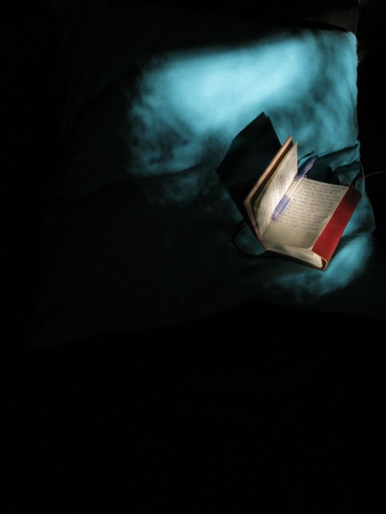 De zon speelt met haar schaduwen, spel van licht en schaduw, de woordenstroom begint te stotteren en het schrijven zo moeilijk omdat het denken sneller gaat. En het niet meer opschrijfbaar is omdat de onafgewerkte zinnen niet meer verstaanbaar zijn.