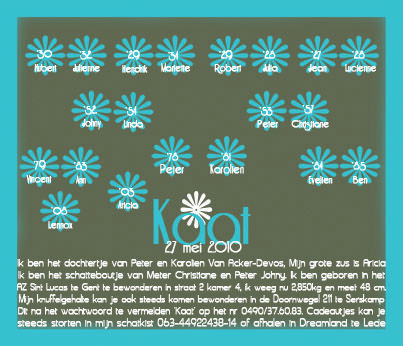 Een tijdje geleden mocht ik jullie onvergetelijke dag vastleggen op de gevoelige plaat ( al is de techniek vandaag wel ietsje anders, het heeft nu veel meer weg van contstant batterijen opladen, kaartjes verwisselen en aansluiten op de computer...), het was een gezellige en ongedwongen dag. Nu x-aantal maanden later was ik terug van de partij, ditmaal mocht ik de geboorte van jullie dochter op een originele manier aan iedereen helpen verkondigen. Langs deze weg wil ik jullie nogmaals proficiat wensen, Kaat je bent een kleine snoezige baby, en bedanken voor het vertrouwen jullie in mij hebben
