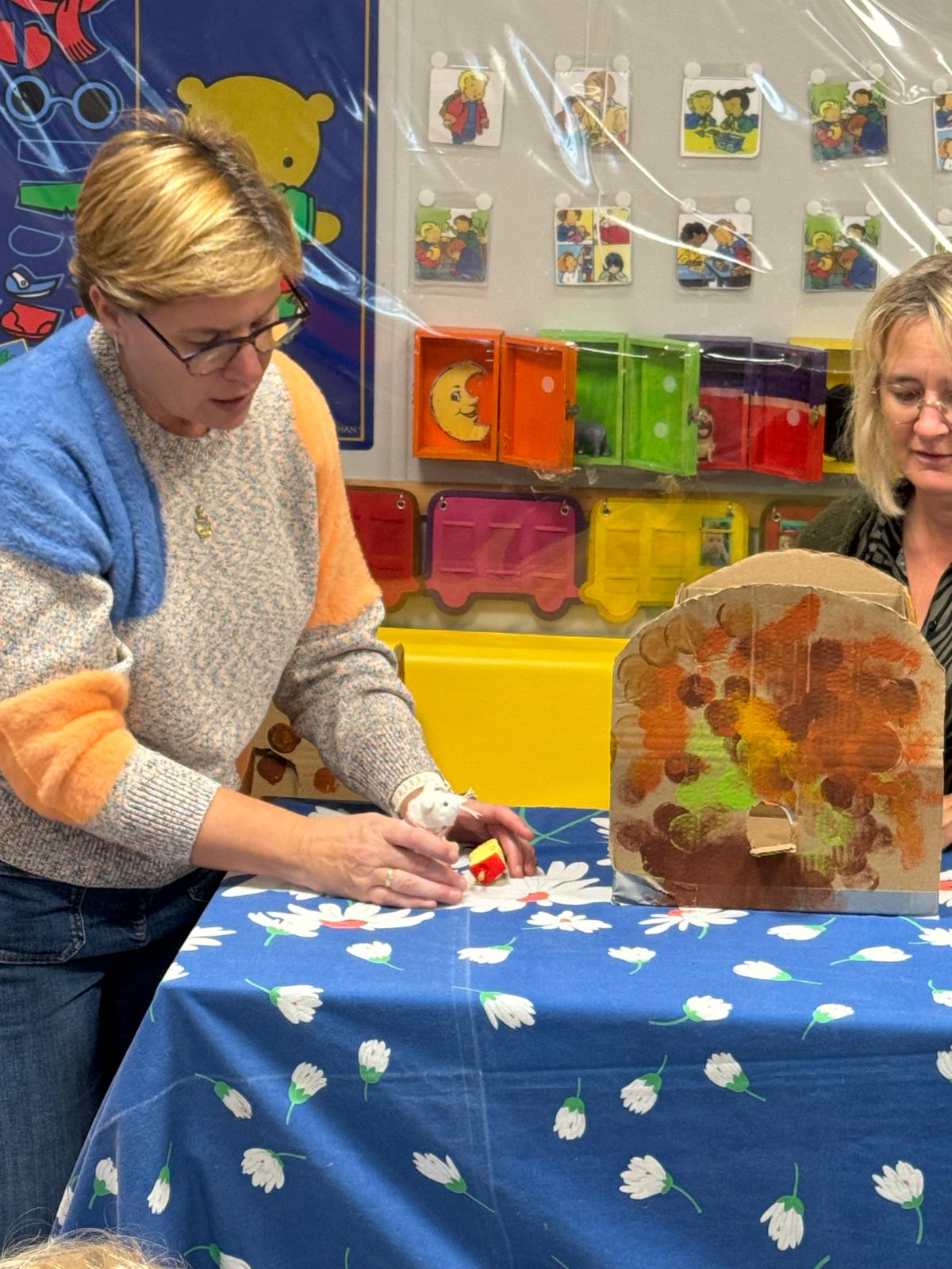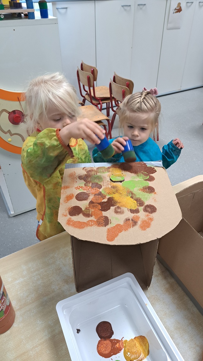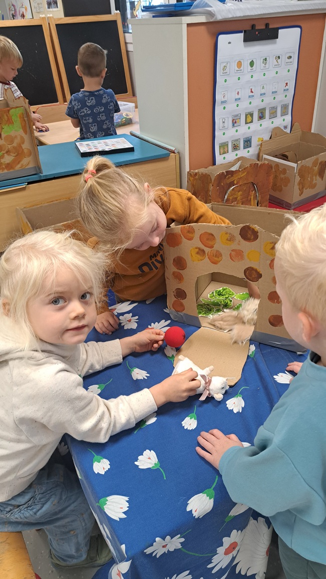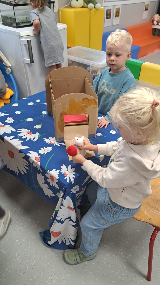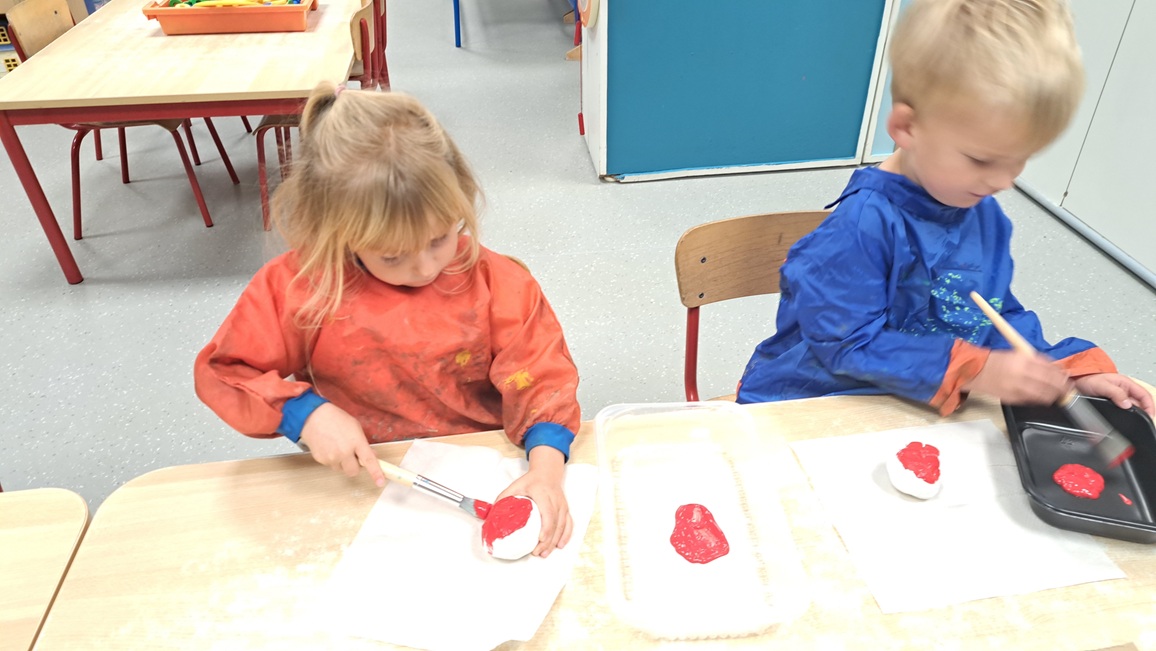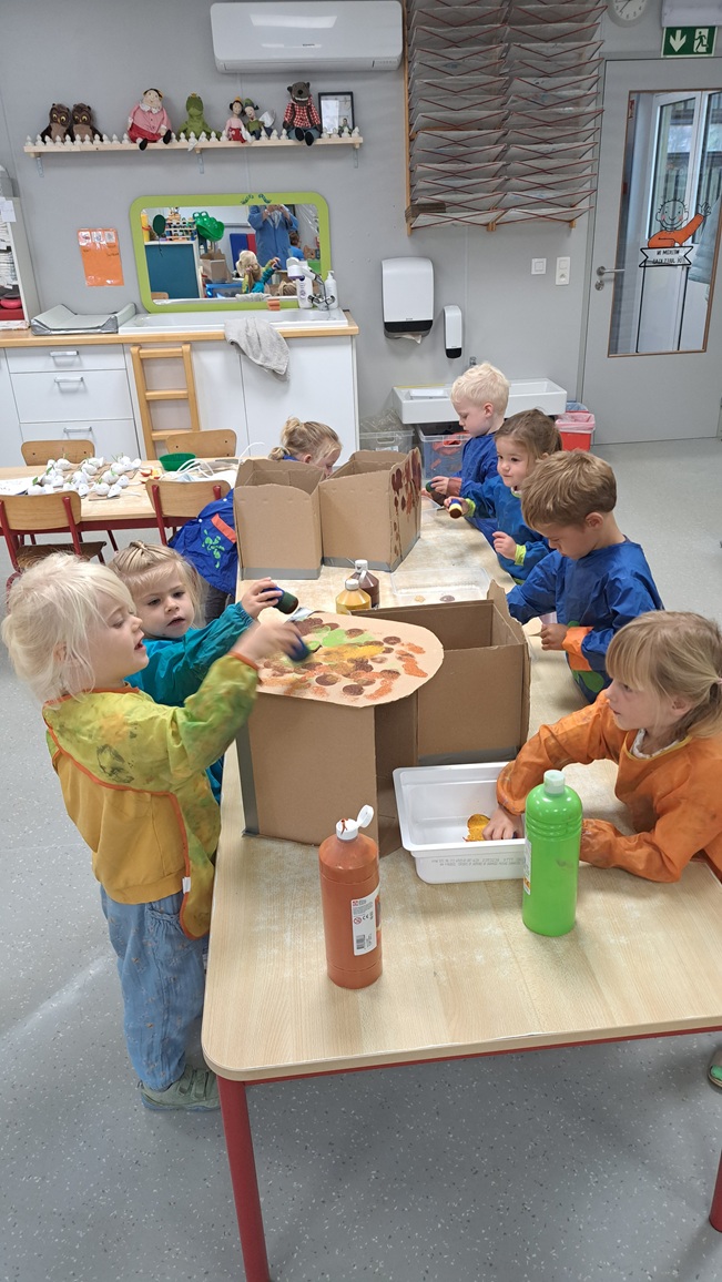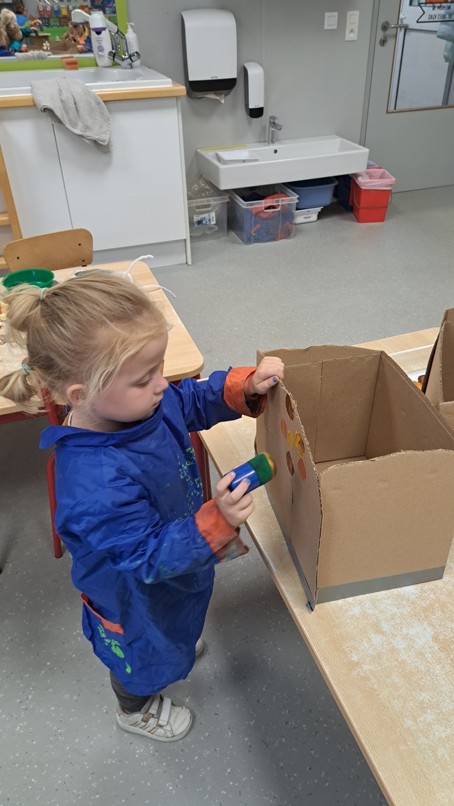 Uit dozen maken we de holletjes van de personages uit het boek na. Met stempels bestempelen we de holletjes.