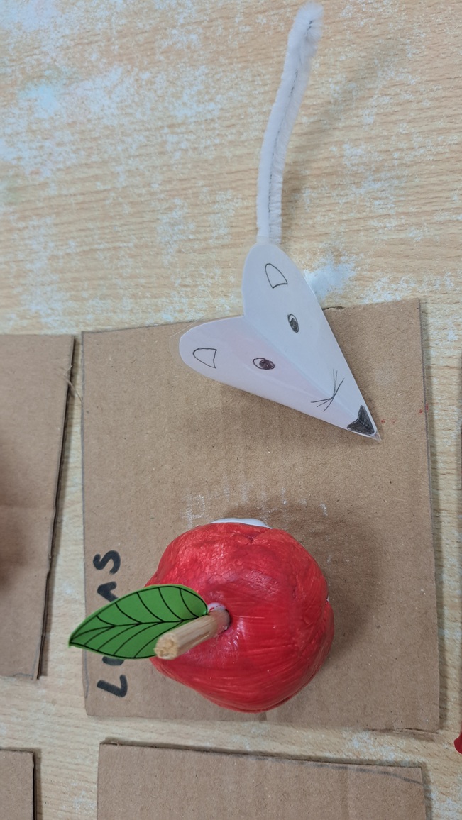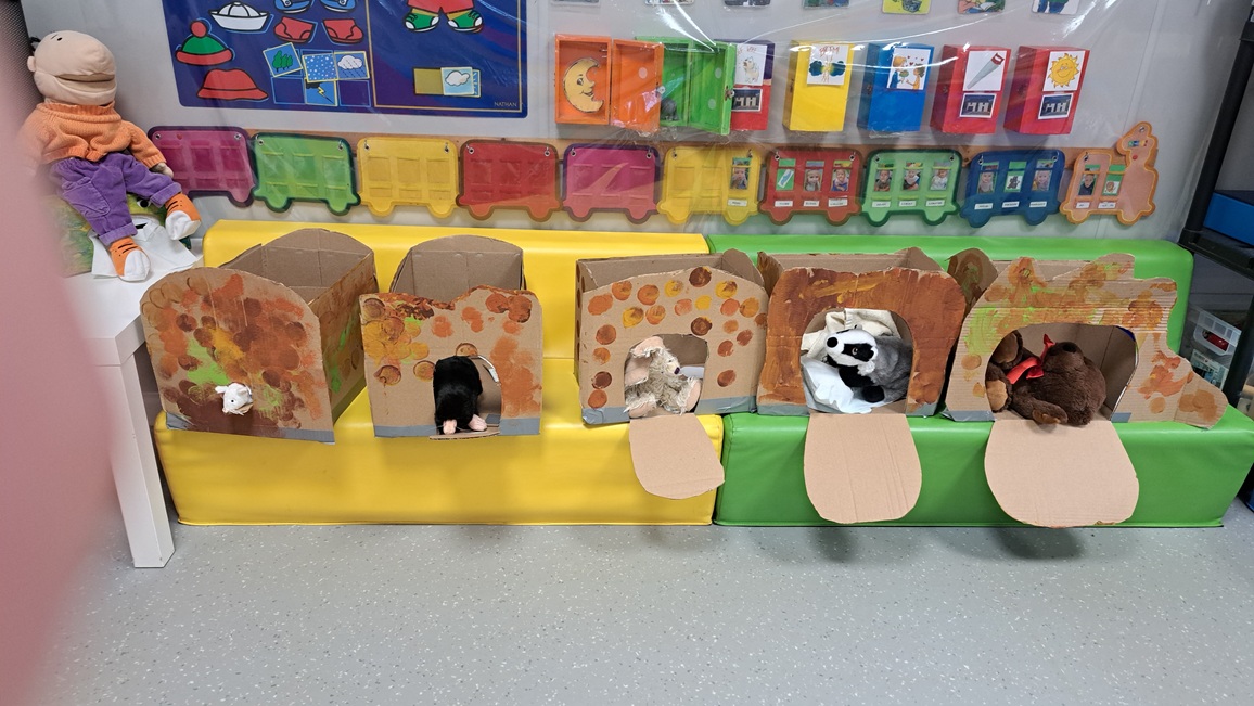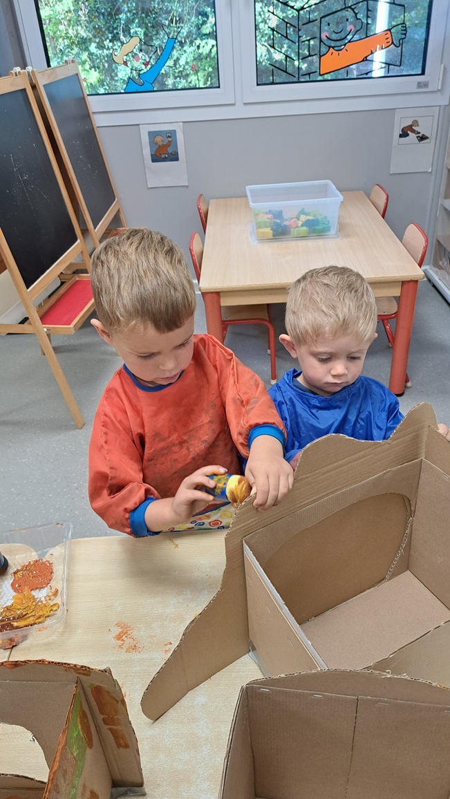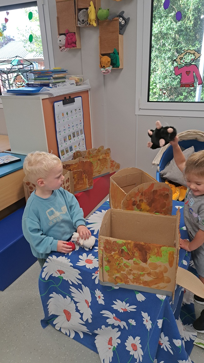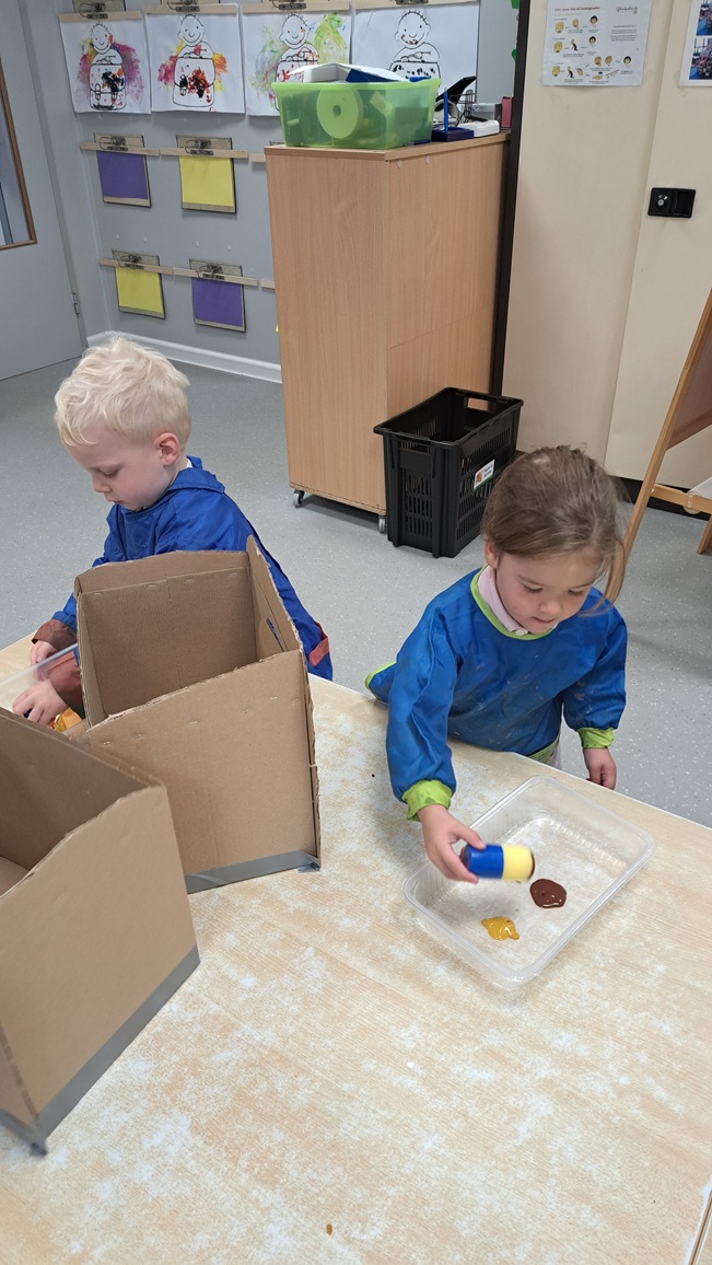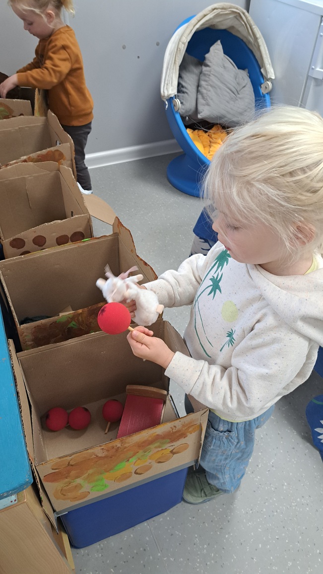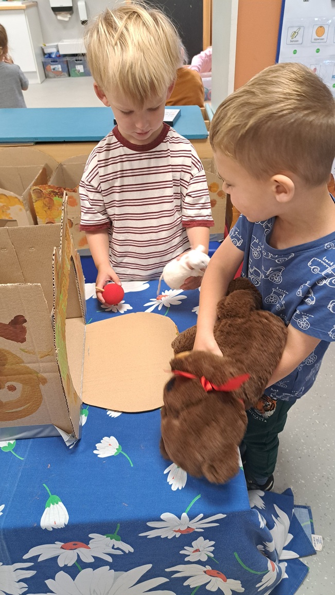 Uit dozen maken we de holletjes van de personages uit het boek na. Met stempels bestempelen we de holletjes.