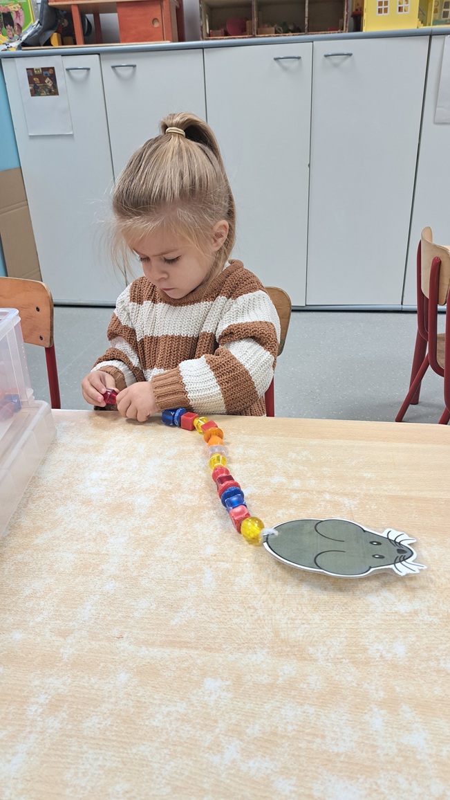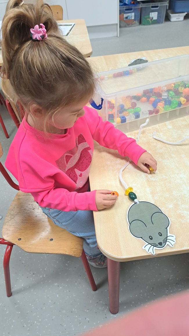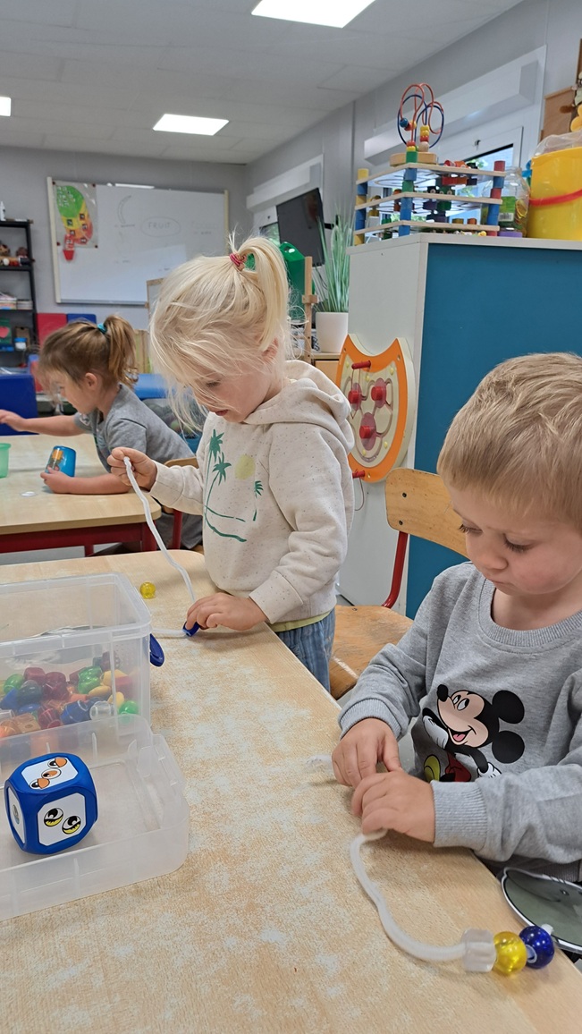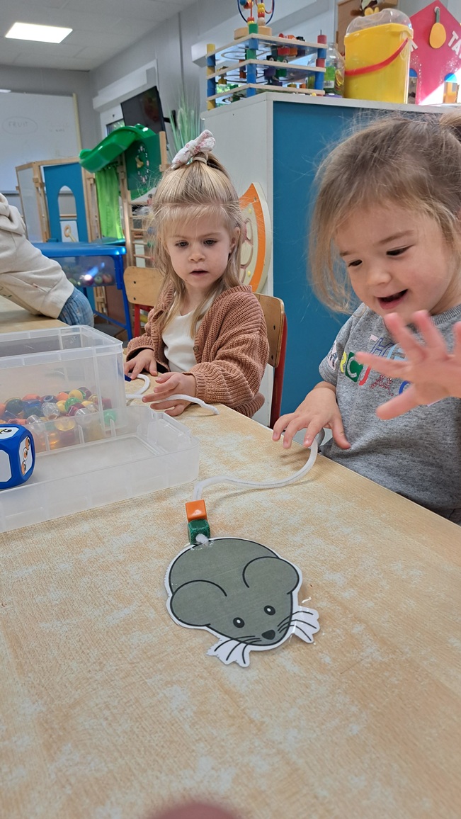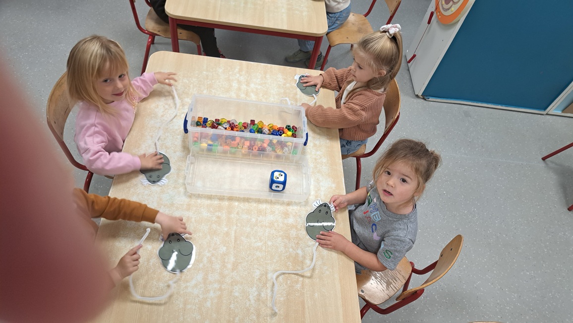 Een dobbelsteen tot 3 kunnen we aflezen. Het aantal dat we werpen met de dobbelsteen stemt overeen met het aantal kralen die we op de muizenstaart schuiven.
