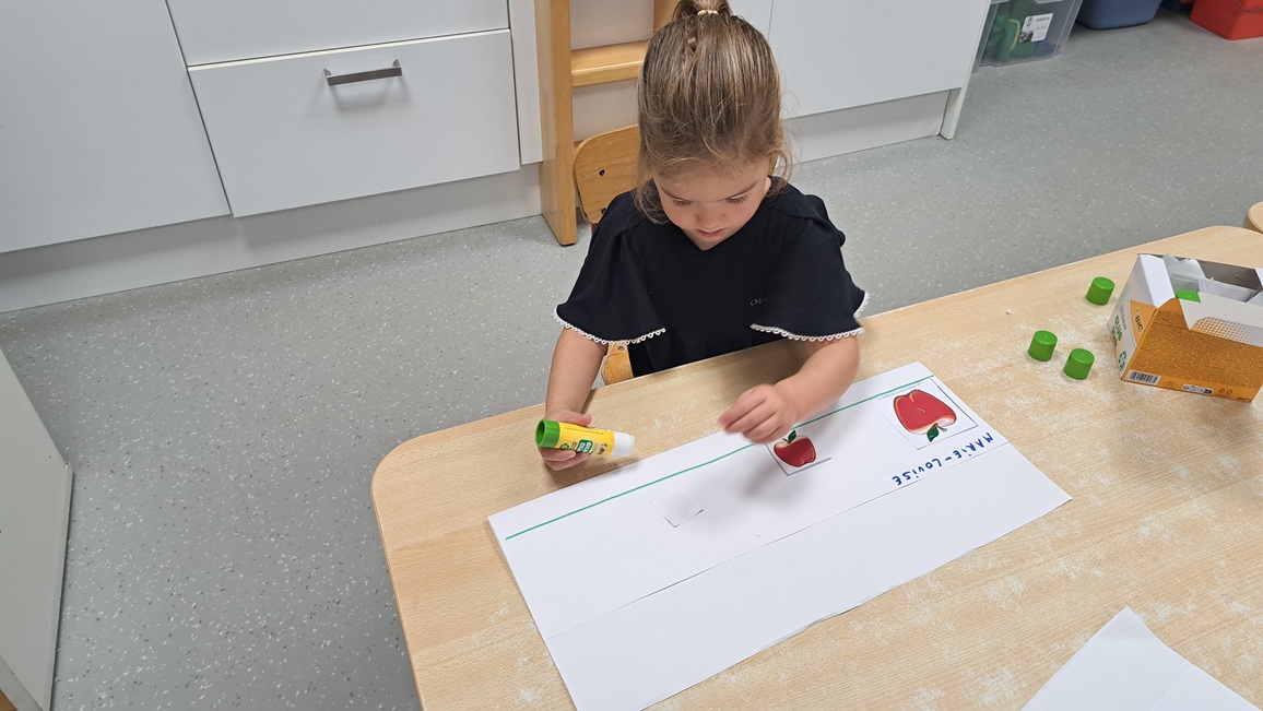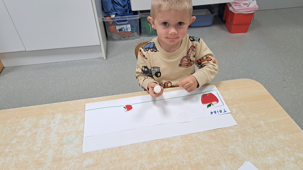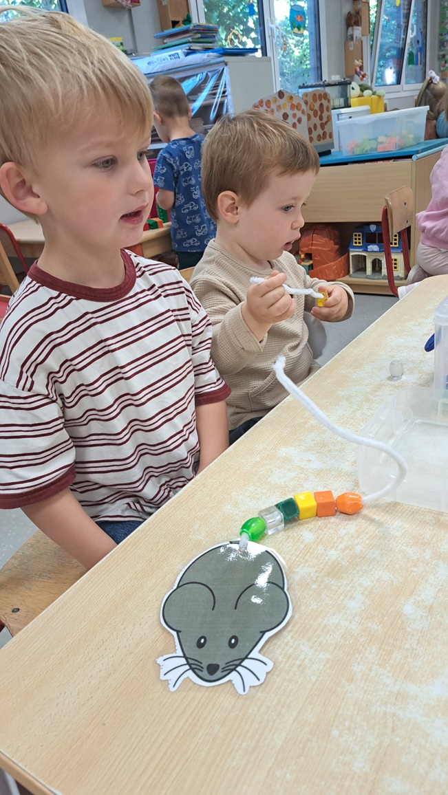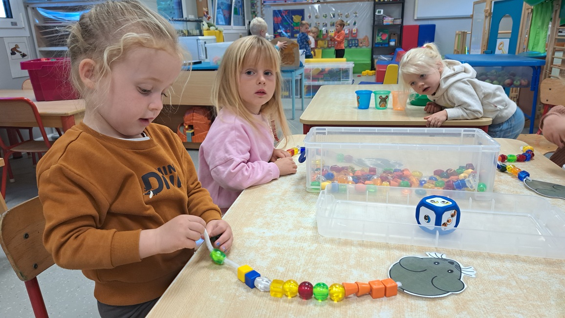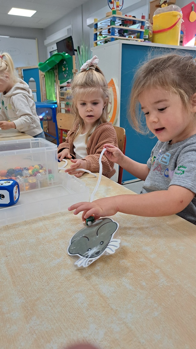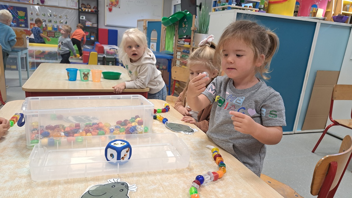 Een dobbelsteen tot 3 kunnen we aflezen. Het aantal dat we werpen met de dobbelsteen stemt overeen met het aantal kralen die we op de muizenstaart schuiven.