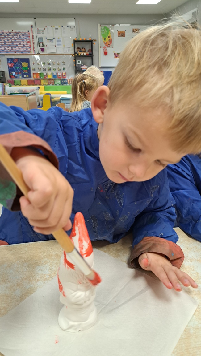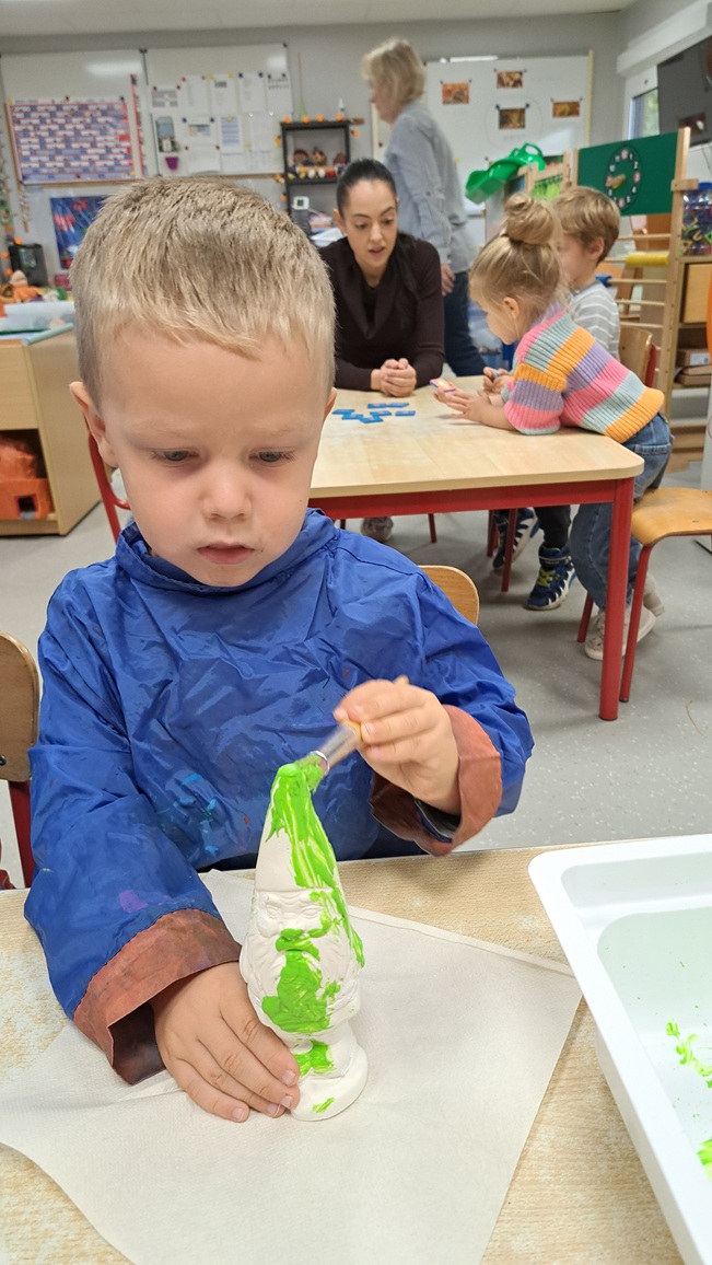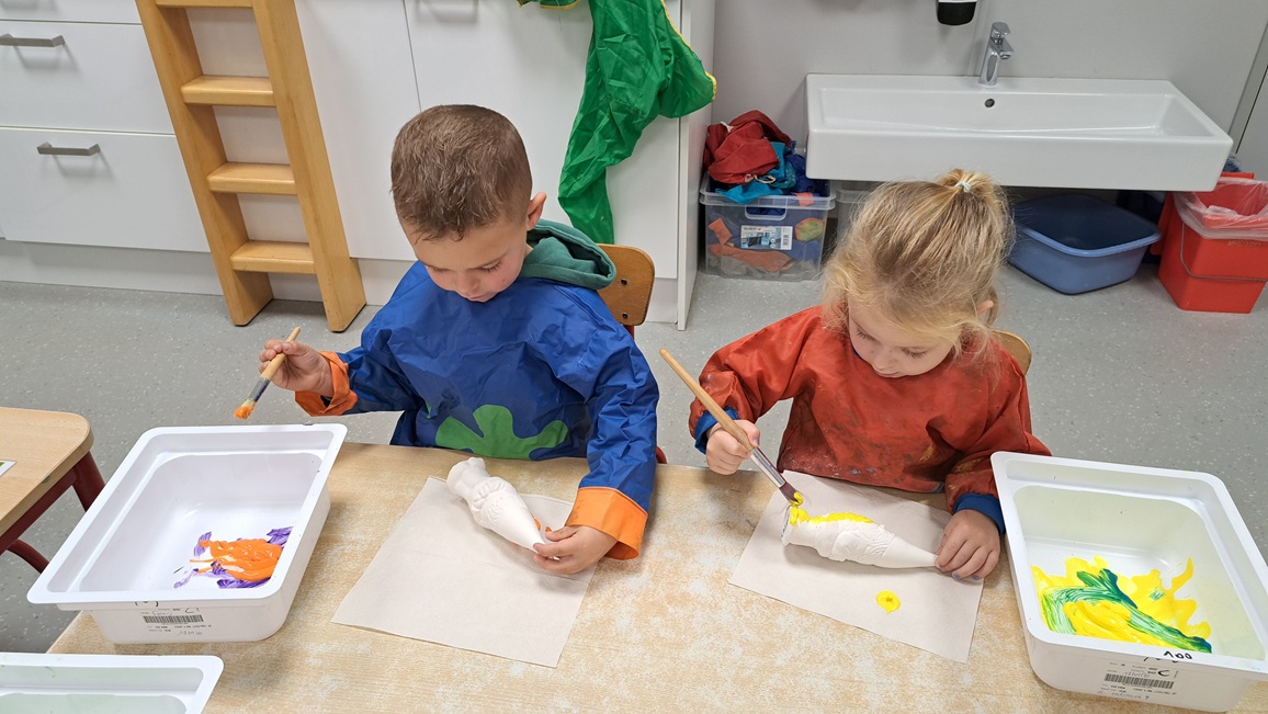 Uit gips maken we eendjes.  Deze eendjes beschilderen we en versieren we met bloemetjes.  Een stukje karton bestempelen we met blauwe en witte verf.  Hierop komt het versje en het eendje = geschenk grootouders.