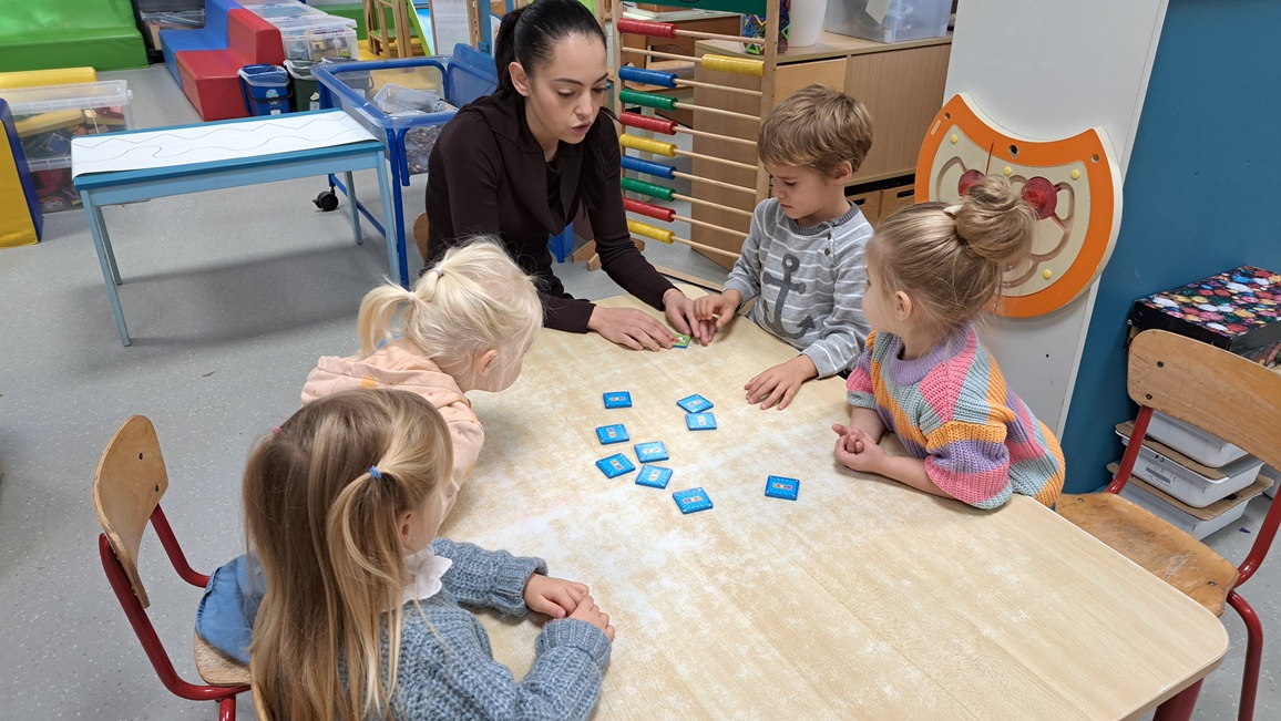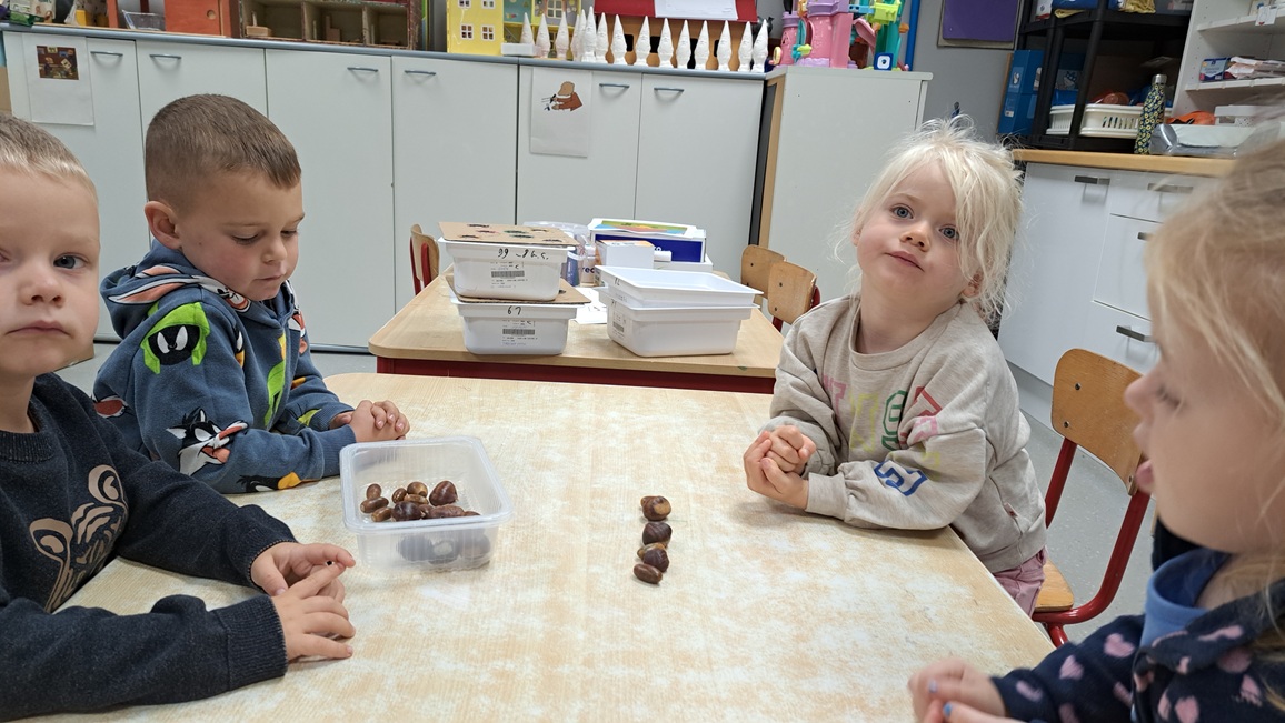 We plaatsen een eend op, onder, voor achter, tussen de stoel(en).